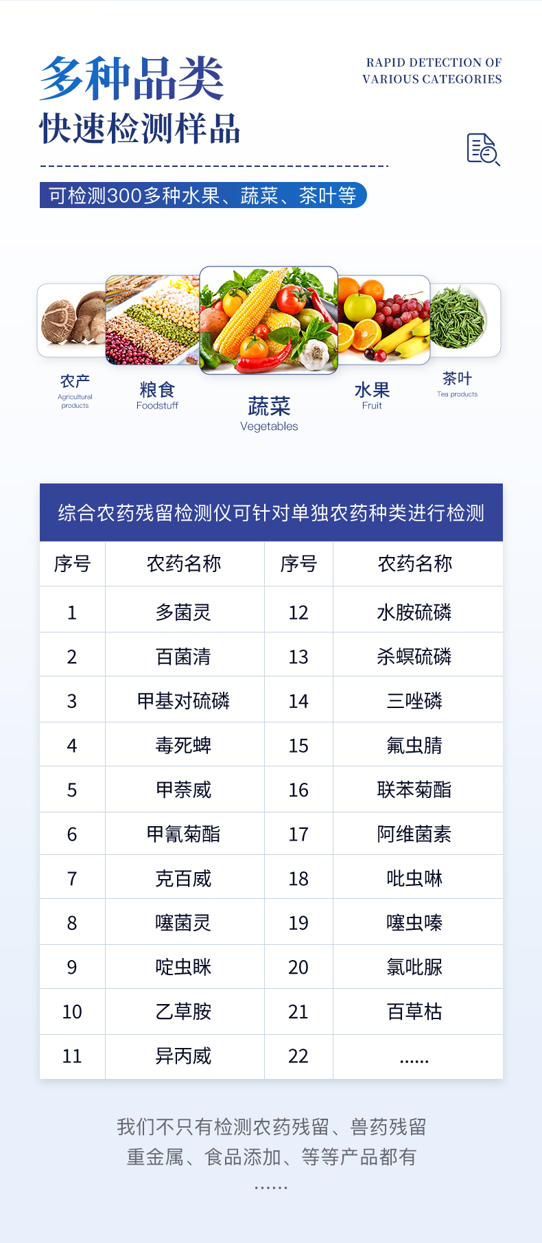 機(jī)箱采用工業(yè)級(jí)ABS工程塑料箱,方便攜帶,穩(wěn)固耐用,便于流動(dòng)測試。 智能操作系統(tǒng),采用更加人性化操作,主控采用多核處理器,主頻1.88Ghz,運(yùn)轉(zhuǎn)速度更快速,穩(wěn)定性更強(qiáng)。自動(dòng)判斷樣品是否合格,檢測結(jié)果更加直觀。 儀器具有100多種蔬菜名稱菜單庫,分類管理,并可按需添加或刪除蔬菜名,編輯蔬菜名稱,可直接打印出蔬菜名稱。檢測通道:12個(gè)檢測通道,可以同時(shí)測試多個(gè)樣品,循環(huán)檢測,即放即檢,每個(gè)樣品由程序控制分別獨(dú)立工作,不會(huì)互相干擾。 儀器具有wifi聯(lián)網(wǎng)功能,可將數(shù)據(jù)快速上傳電腦,進(jìn)行數(shù)據(jù)管理與統(tǒng)計(jì),4G信號(hào)GPRS遠(yuǎn)傳功能,可插手機(jī)卡實(shí)現(xiàn)數(shù)據(jù)遠(yuǎn)傳平臺(tái),。顯示方式:7英寸高靈敏真彩觸摸屏顯示,人性化中文操作界面,讀數(shù)直觀、簡單。 打印機(jī)采用串口5v打印,可選擇手動(dòng)打印或者自動(dòng)打印,三分鐘出打印結(jié)果,打印格式為檢測人姓名、吸光度差值、檢測時(shí)間、檢測機(jī)構(gòu)、樣品名稱及結(jié)果判定。光源采用進(jìn)口超高亮發(fā)光二極管,具有低功耗、高精度、穩(wěn)定性強(qiáng)、光源可控可以關(guān)掉不使用的光源,響應(yīng)速度快等優(yōu)點(diǎn)。 智能恒流穩(wěn)壓,光強(qiáng)自動(dòng)校準(zhǔn),長時(shí)間連續(xù)工作光源無溫漂現(xiàn)象。采用USB2.0接口設(shè)計(jì),方便數(shù)據(jù)的存貯和移動(dòng),并可隨時(shí)與計(jì)算機(jī)直接相連,并且可用計(jì)算機(jī)控制儀器。實(shí)現(xiàn)數(shù)據(jù)查詢、瀏覽、分析、統(tǒng)計(jì)、打印等。 智能化程度高,儀器具有自檢功能:具有開機(jī)自檢和調(diào)零功能,具有自動(dòng)檢測重復(fù)性功能儀器具有自身保護(hù)功能,可設(shè)置用戶名及密碼,防止非工作人員操作等。 采用DC12v直流供電,安全系統(tǒng)更高,并且配備6A鋰電池充電器。儀器具有重新校準(zhǔn)、鎖定、恢復(fù)出廠設(shè)置功能。