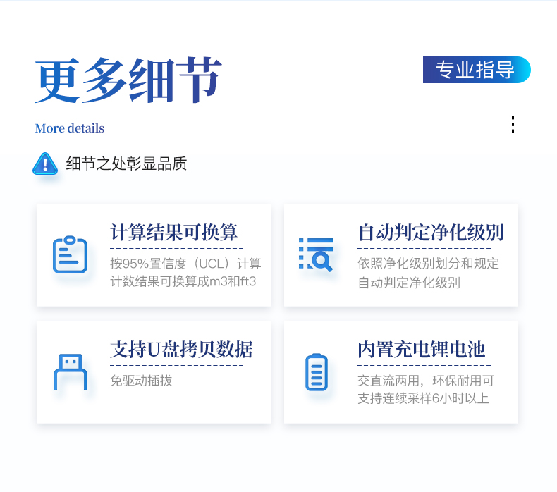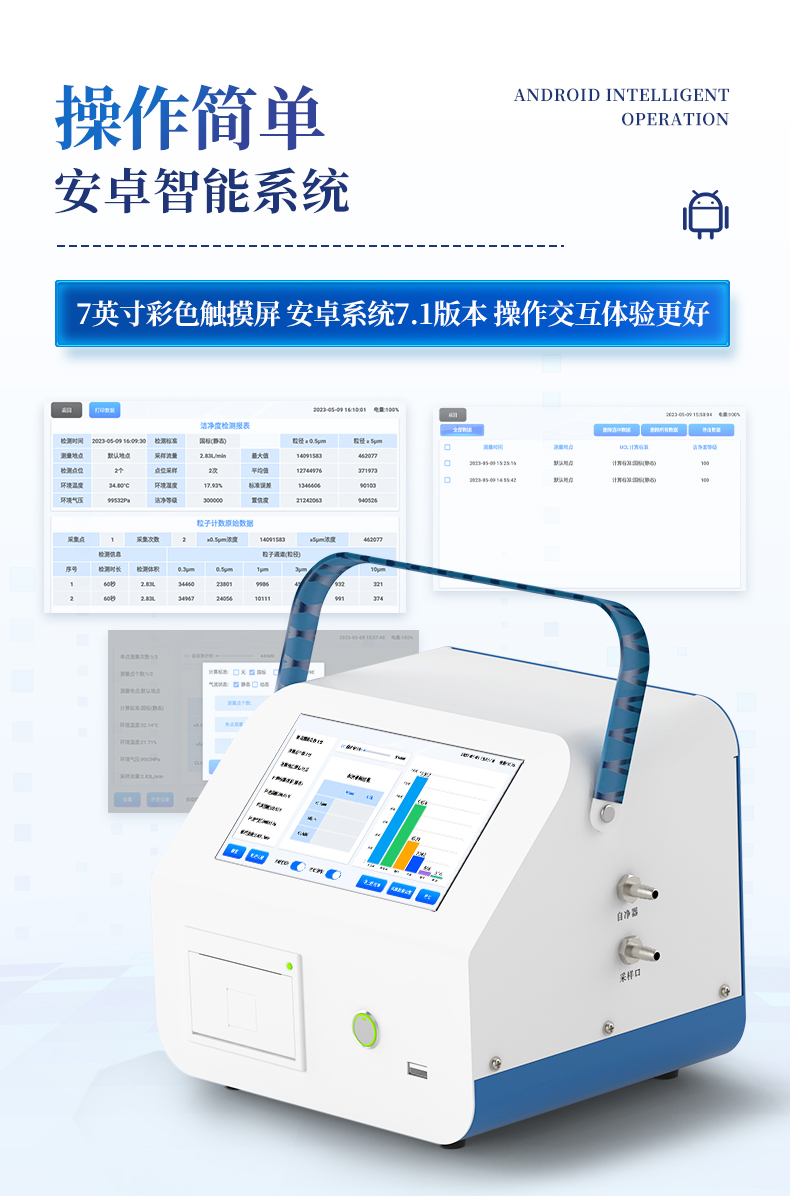 1、安卓系統(tǒng)7.1版本,操作交互體驗更好。 2、內(nèi)置溫濕度傳感器、環(huán)境氣壓傳感器 3、核心部件光散射傳感器明顯消除腔體的雜散光,信噪比大為提高。從而使測量更準確更可靠。 4、按95%置信度(UCL)計算,計數(shù)結(jié)果可換算成m3和ft3 5、依照凈化級別劃分和規(guī)定,自動判定凈化級別,使用便利。 6、帶審計追蹤功能,可查詢、可追溯、可控制,符合FDA 21CFR PART11規(guī)范 7、支持wifi、藍牙傳輸,數(shù)據(jù)可無線上傳;同時支持U盤拷貝數(shù)據(jù),免驅(qū)動插拔。 8、配置監(jiān)管平臺,檢測結(jié)果可直接無線傳至平臺,進行潔凈度長短期分析,輔助管理。 9、內(nèi)置新一代高速熱敏打印機,可選擇所需要打印的粒徑通道,靈活打印結(jié)果。 10、交直流兩用,內(nèi)置充電鋰電池,環(huán)保耐用可支持連續(xù)采樣6小時以上。 11、便捷簡易伸縮式云臺支架,安裝采樣操作更加方便。