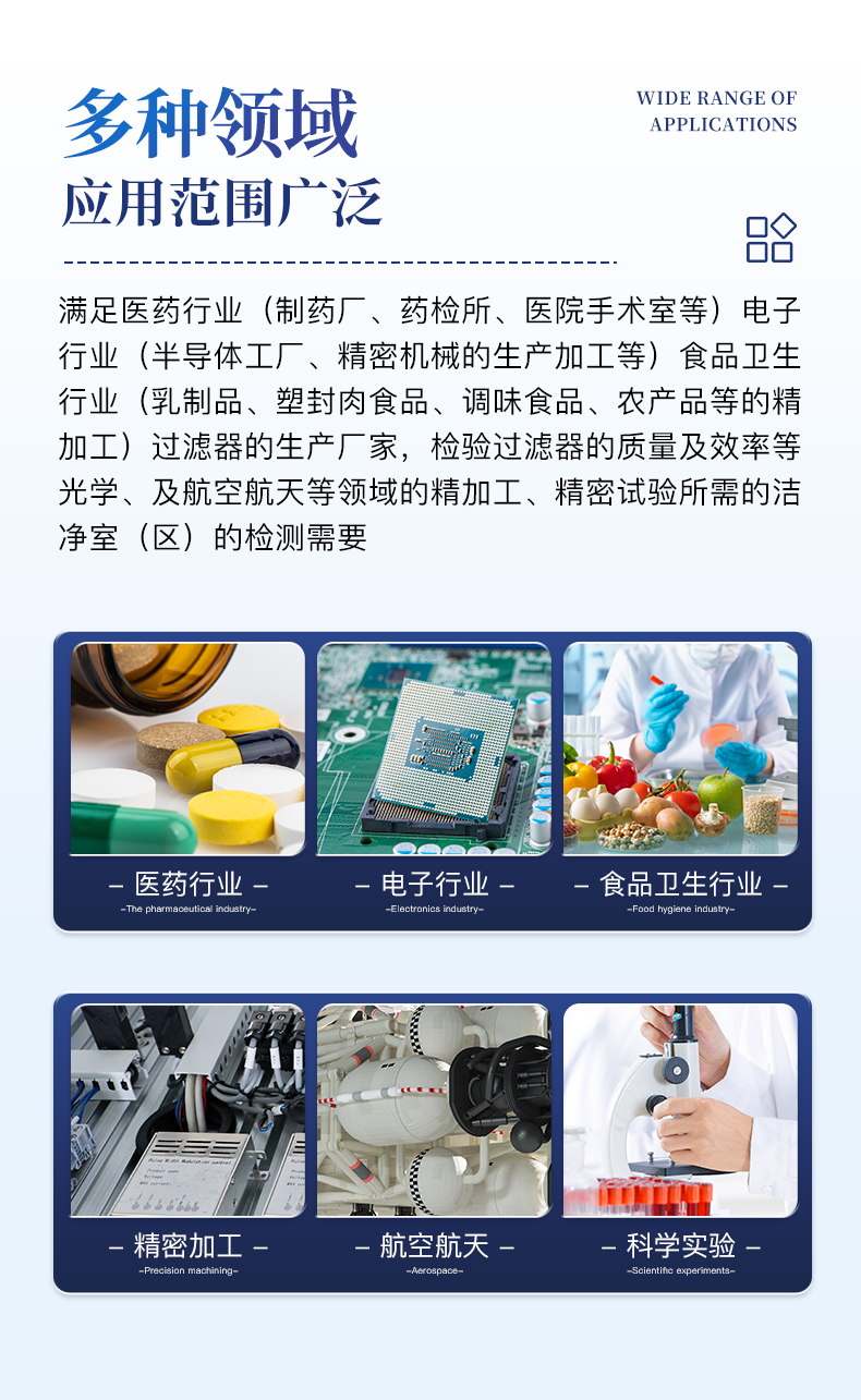 滿足醫(yī)藥行業(yè)(制藥廠、藥檢所、醫(yī)院手術(shù)室等);電子行業(yè)(半導體工廠、精密機械的生產(chǎn)加工等);食品衛(wèi)生行業(yè)(乳制品、塑封肉食品、調(diào)味食品、農(nóng)產(chǎn)品等的精加工);過濾器的生產(chǎn)廠家,檢驗過濾器的質(zhì)量及效率等;光學、及航空航天等領(lǐng)域的精加工、精密試驗所需的潔凈室(區(qū))的檢測需要。