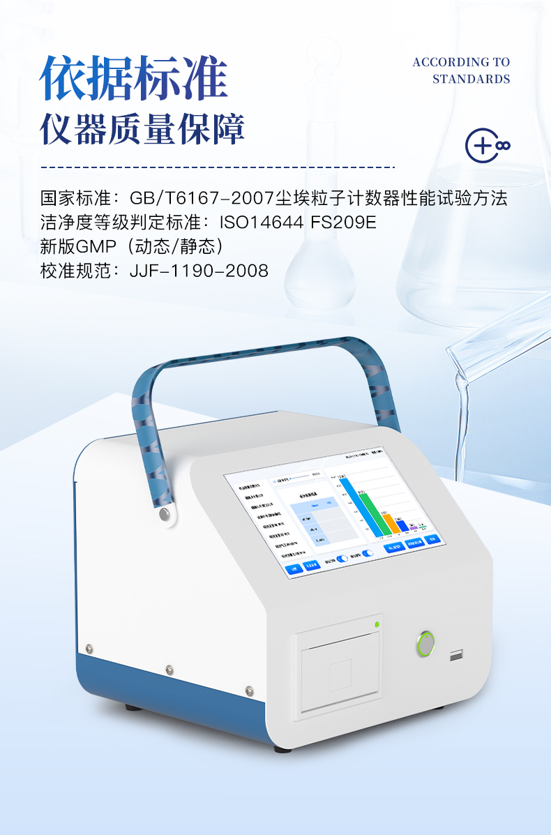 國家標準:GB/T6167-2007塵埃粒子計數(shù)器性能試驗方法 潔凈度等級判定標準:ISO14644 FS209E ,新版GMP(動態(tài)/靜態(tài)) 校準規(guī)范:JJF-1190-2008