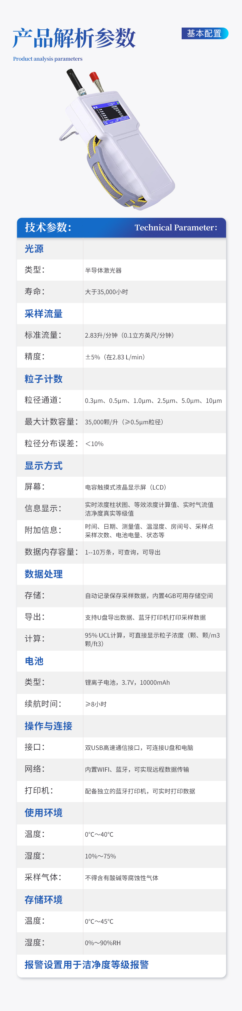 粒徑通道:0.3μm、0.5μm、1.0μm、2.5μm、5.0μm、10μm **計數(shù)容量:35,000顆/升(≥0.5μm粒徑) 重復(fù)性相對誤差:<10% 粒徑分布誤差:0.5μm粒徑擋分布誤差±30% |