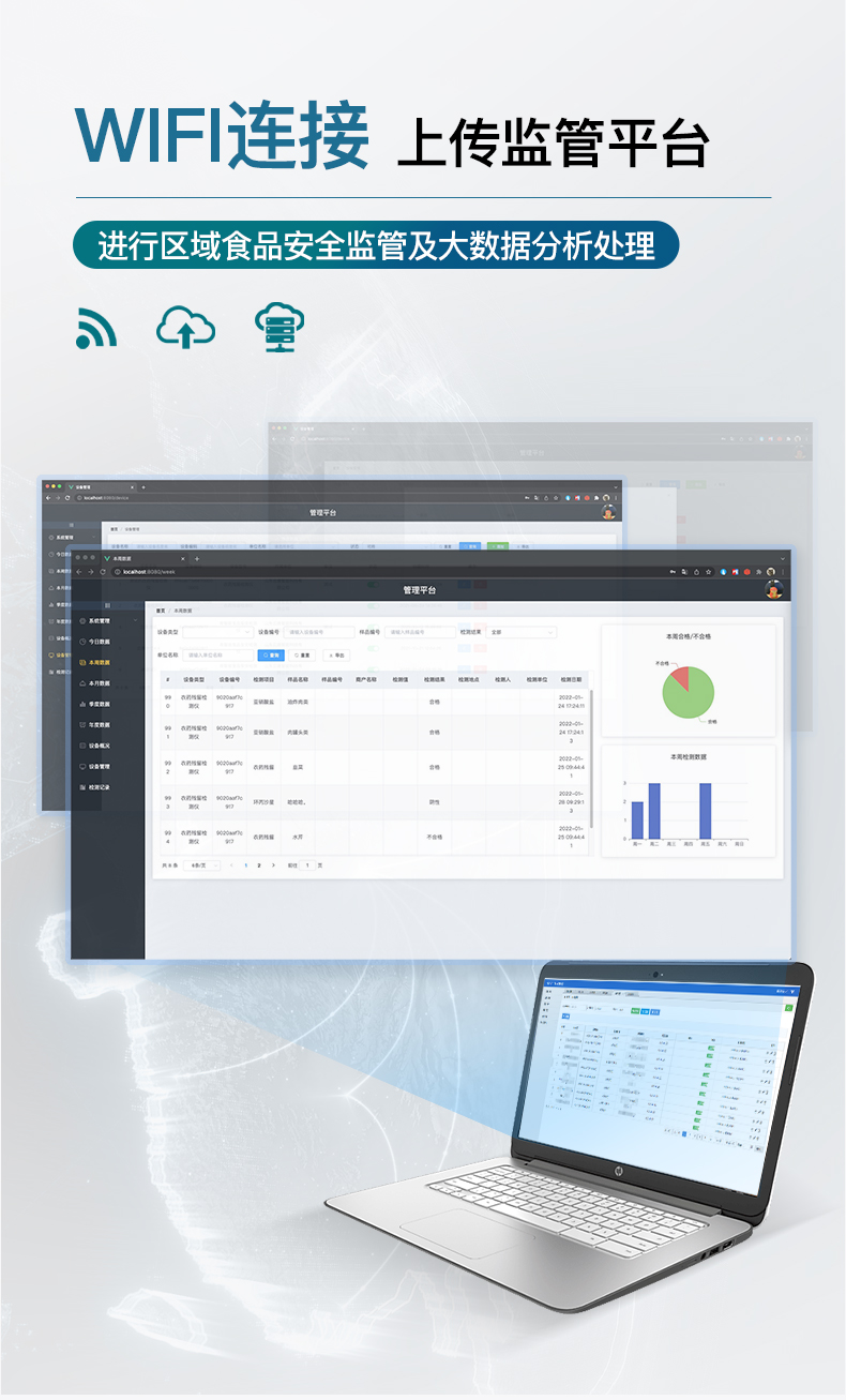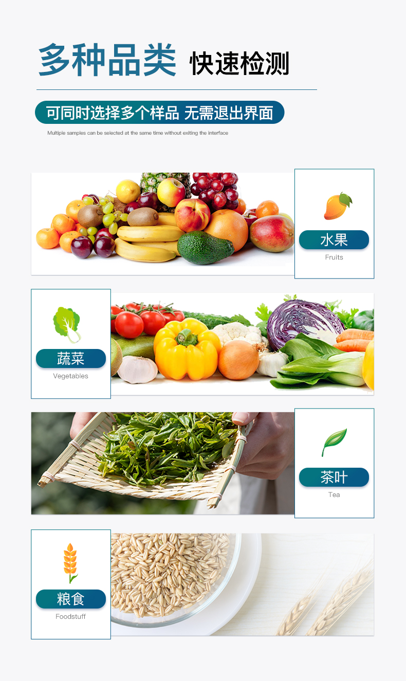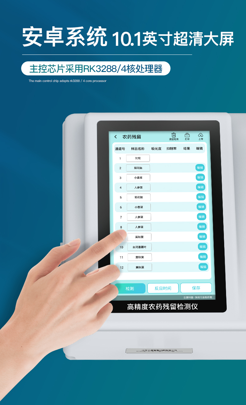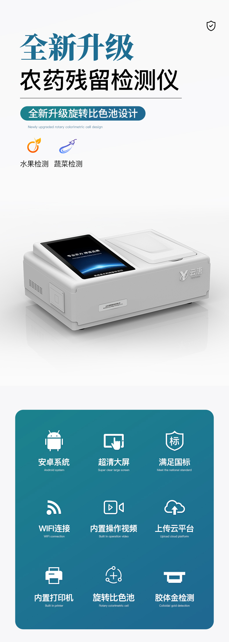 儀器采用臺式一體化系統檢測技術,將分光光度模塊、新型農殘檢測模塊、數字化管理模塊、無線通訊模塊高度集成于一體,支持檢測200種食品安全檢測項目,同時預留升級檢測方法。儀器檢測模塊標準化、智能化,可隨意自由組合。檢測箱體內置多個標準檢測單元,檢測模塊可以調整配置。儀器采用全新安卓智能系統,主控芯片采用 ARM Cortex-A7,RK3288/4核處理器,10.1寸高清液晶觸摸豎屏,更加**的UI交互界面,運轉快捷;儀器配備無線通信模塊: 4G(APN)通訊模塊、Wifi模塊,藍牙傳輸,同時具有雙USB接口以及RJ45接口能以多種方式實現數據保存和數據傳輸功能。創(chuàng)新檢測模式:★檢測通道:≥12通道;采用精密旋轉比色池設計,使用同芯片同光源校準精度,解決不同光源之間的誤差值。1-12通道間誤差0.1%。(***:**202022821055.2)★儀器具有自動識別比色皿檢測功能,即:將樣品比色皿放入儀器后,點擊樣品檢測,儀器自動識別比色皿進行通道檢測。進口高精光源:高精度進口四波長冷光源,通道配置 410、520、590、630nm 波長光源,一個光源芯片驅動一個光源,誤差極小,每臺設備單獨**校準光源,**比對,同時參照四種不同波段光源全方位覆蓋市面上99%的農殘食品項目檢測。智能化操作系統:便捷操作系統:設備檢測時可在同一檢測界面自動對應相關檢測通道一次性選擇1-12個樣品名稱,無須退出界面,節(jié)省操作時間。數據集成系統:設備首頁自動統計檢測數據包含:周檢測數據、月檢測數據,全部檢測總數量,均包含檢測總數,合格數,不合格數,以及相關柱形分析圖,對各項檢測數據清晰掌握,無需電腦查詢,更加快捷直觀。項目預設系統:支持添加單個及多個相同或不相同的任務預設,一鍵快速調取,每一個任務分別可以設置不同的樣品、批次、編號、來源、備注、抽樣信息、檢測信息、受檢信息、復核信息等更多信息。無縫鏈接平臺和APP實時查看下發(fā)任務。數據監(jiān)管系統:同步對接監(jiān)管平臺,數據可局域網和互聯網數據上傳,檢測結果可選擇直接傳至食品安全監(jiān)管平臺。集成OSS輸出存儲服務、區(qū)分設備定向管理應用,進行區(qū)域食品安全監(jiān)管及大數據分析處理與數據統計,檢測區(qū)域食品安全長短期動態(tài),達到食品安全問題預估、預警。自定義打印系統:內置全新打印系統,新創(chuàng)自定義打印方式,可按需靈活設置開啟或關閉:產品合格證(國家農業(yè)部標準要求),二維碼,抽樣信息、檢測信息,受檢信息、復核信息、抽樣日期、檢測日期等信息的打印。系統遠程更新功能:可定向分客戶分儀器更新系統,按照不同客戶后期實際需求添加項目,無需機器返廠,即可遠程實時升級全新系統,節(jié)省時間成本及避免運輸造成設備損壞。儀器主機采用一體化防水、抗壓、防撞擊、防腐蝕箱體設計,同時配備交直流供電,可連接車載電源,可選配大容量充電鋰電池,滿足現場野外檢測需求。安全證書,放心保障:儀器具有中國計量科學研究院校準證書,權威認證。