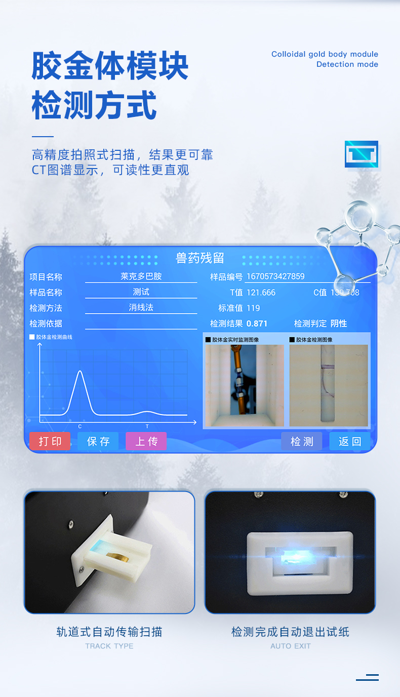 | 安卓智能操作系統(tǒng),采用更加**的UI交互界面,儀器具有wifi聯(lián)網(wǎng)上傳、4G聯(lián)網(wǎng)傳輸、GPRS無線遠(yuǎn)傳、網(wǎng)線連接功能,快速批量上傳數(shù)據(jù)。 | 智能化程度高,儀器具有自檢功能:具有開機(jī)自檢和調(diào)零功能,具有自動(dòng)檢測重復(fù)性功能。 | 新一代高速熱敏打印機(jī),檢測完成可自動(dòng)打印或批量打印檢測報(bào)告和二維碼。 | 儀器帶有監(jiān)管平臺(tái),數(shù)據(jù)可局域網(wǎng)和互聯(lián)網(wǎng)數(shù)據(jù)上傳,檢測結(jié)果直接傳至食品安全監(jiān)管平臺(tái)。進(jìn)行區(qū)域食品安全監(jiān)管及大數(shù)據(jù)分析處理與數(shù)據(jù)統(tǒng)計(jì),檢測區(qū)域食品安全長短期動(dòng)態(tài),達(dá)到食品安全問題預(yù)估、預(yù)警 | 一體化主機(jī),包含食品安全檢測模塊、多通道農(nóng)藥殘留檢測模塊、膠體金免疫層析檢測模塊。 | 一體化便攜式快檢設(shè)備,滿足現(xiàn)場及流動(dòng)檢測使用需求,能夠在同一軟件下實(shí)現(xiàn)所有檢測項(xiàng)目的檢測,并可通過同一窗口直觀顯示檢測結(jié)果。 | 膠體金模塊檢測方式:軌道式自動(dòng)傳輸掃描,檢測完成后自動(dòng)退出檢測卡。 | CT線自動(dòng)識(shí)別,無需手動(dòng)調(diào)整。 | 內(nèi)置強(qiáng)大的數(shù)據(jù)庫,具有多品類多種類樣品菜單功能,可靈活選擇檢測樣品,不同的檢測通道可同時(shí)檢測不同的樣品項(xiàng)目。也可在儀器上直接編輯錄入樣品名稱、檢測指標(biāo)、送檢單位等信息并保存進(jìn)樣品數(shù)據(jù)庫。 | 產(chǎn)品內(nèi)置操作演示視頻,是您身邊的化驗(yàn)指導(dǎo)專家。 | 樣品處理簡單省力,整體操作快速、安全、便捷。 | 儀器具有自身保護(hù)功能,可設(shè)置用戶名及密碼,防止非工作人員操作等。 | 高靈敏度,高檢測精度,高重復(fù)性精度,掃描式高精度光學(xué)傳感器。 | 結(jié)果判定線可修改,對(duì)照值標(biāo)定值可保存,斷電不丟失數(shù)據(jù)。 | 兼容市場上所有的膠體金卡,使用耗材不受限制,極大增強(qiáng)用戶使用體驗(yàn)。 | 儀器具有重新校準(zhǔn)、鎖定、恢復(fù)出廠設(shè)置功能。 |