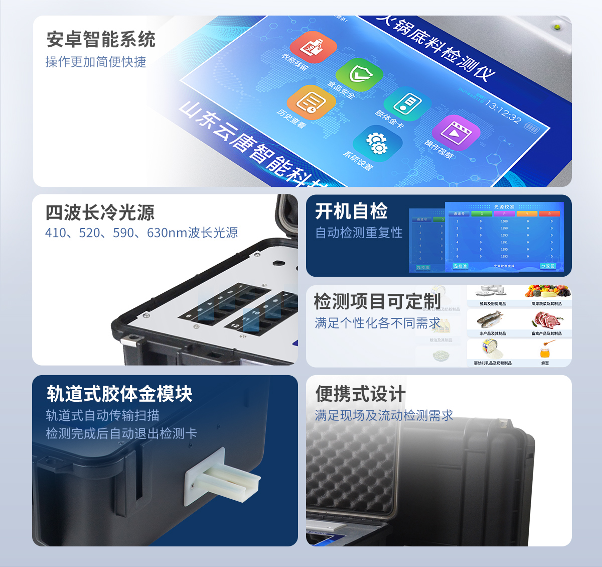5、一體化便攜式快檢設(shè)備,滿足現(xiàn)場及流動檢測使用需求,能夠在同一軟件下實現(xiàn)所有檢測項目的檢測,并可通過同一窗口直觀顯示檢測結(jié)果。