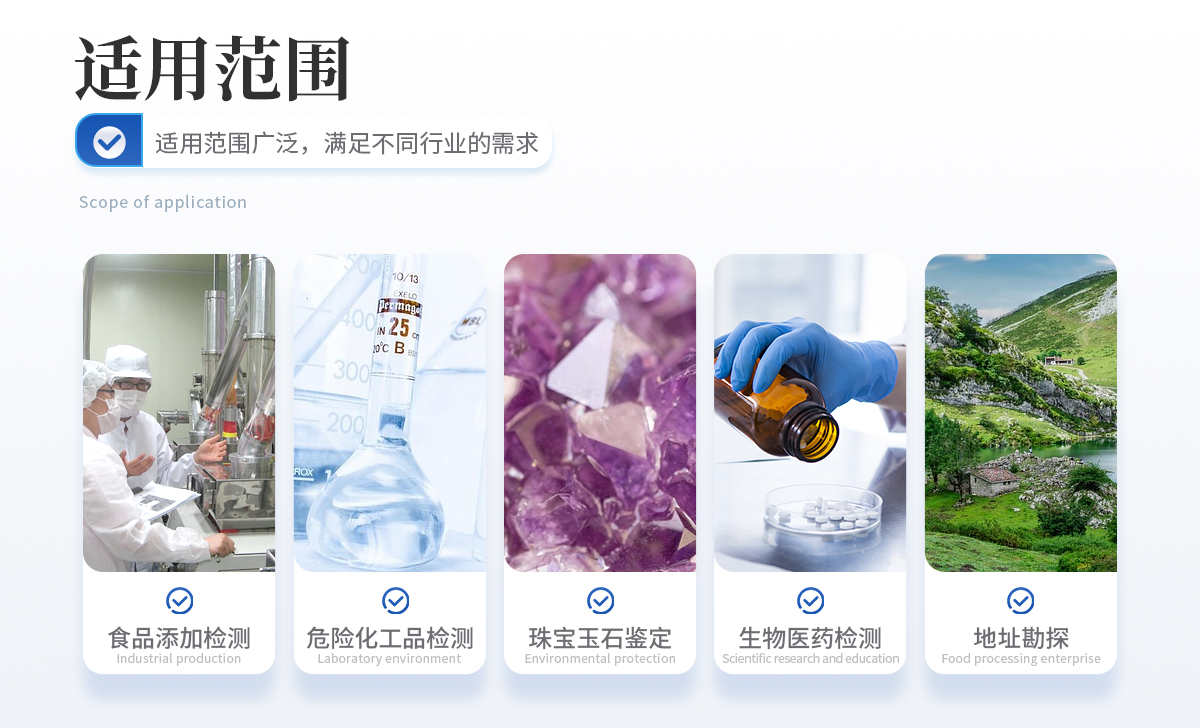 食品違禁添加物、色素添加、農(nóng)獸藥殘留檢測 爆炸物、危險化工品、易燃易爆品檢測 珠寶玉石鑒定、文物鑒別 生物醫(yī)藥檢測、材料表征、地址勘探等 其他各類訂制應(yīng)用
