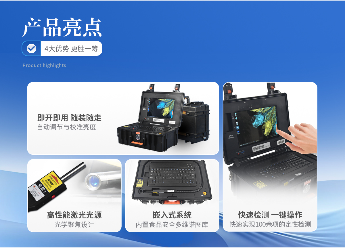 更專業(yè) 785nm光源:有效抑制熒光,適合便攜式移動應(yīng)用 超寬的光譜范圍:檢測物質(zhì)種類更多 更高的信噪比:超強的微小信號探測能力 優(yōu)質(zhì)激光光源:數(shù)字可調(diào)高功率輸出,窄線寬保障譜圖質(zhì)量 更便捷 光學(xué)聚焦設(shè)計:可以隔著塑料袋、玻璃瓶直接檢測 快速自穩(wěn)定光源:機器啟動無預(yù)熱時間,即開即用 超快檢測速度:一秒出結(jié)果 便攜式設(shè)計:獨立可充電電源供電,隨裝隨走,適合各種現(xiàn)場快檢 更貼合應(yīng)用 在線譜圖庫:提供各行業(yè)應(yīng)用多維譜圖庫,支持在線升級 專業(yè)分析算法:智能解譜,自動匹配,多組分分析 行業(yè)應(yīng)用軟件:提供針對行業(yè)專用軟件,支持客戶訂制