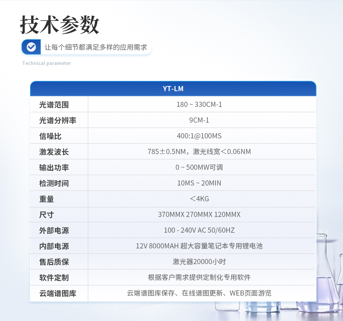 規(guī)格:YT-LM標準版 光譜范圍:180 ~ 3300cm-1 光譜分辨率:9cm-1 信噪比:400:1@100ms 激發(fā)波長:785+0.5nm,激光線寬< 0.06 nm 輸出功率:0~ 500mW可調(diào) 檢測時間:10ms ~ 20min 重量:<4kg 尺寸:370mmx 270mmx 120mm 外部電源:100-240V AC 50/60Hz 內(nèi)部電源:12V 8000mAH 超大容量筆記本專用鋰電池 售后質(zhì)保:激光器20000小時 軟件定制:根據(jù)客戶需求提供定制化專用軟件 云端譜圖庫:支持云端譜圖保存、 在線譜圖更新、WEB 頁面瀏覽