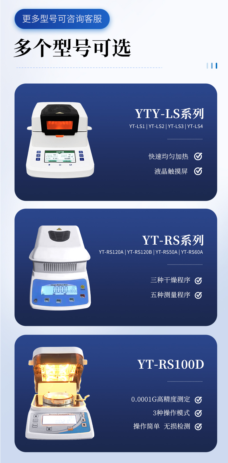 型號 :YT-RS120A,**稱量值:120g ,顯示分度值:0.001g,可  讀  性 :0.01%型號 : YT-RS120B,**稱量值:120g ,顯示分度值: 0.002g ,可  讀  性 :0.01%型號 : YT-RS50A,**稱量值:120g ,顯示分度值: 0.005g ,可  讀  性 :0.01%型號 : YT-RS60A,**稱量值:120g ,顯示分度值: 0.01g ,可  讀  性 :0.1%加 熱 源 鹵素?zé)?  溫度設(shè)置 室溫- 180℃數(shù)據(jù)保存 16組   重量校準(zhǔn) 100g稱盤尺寸  φ110 (mm)外形尺寸 (D*W*H)330*205*165(mm)包裝尺寸 (D*W*H)410*315*335 (mm)凈    重 3.2kg  毛    重 4.6kg