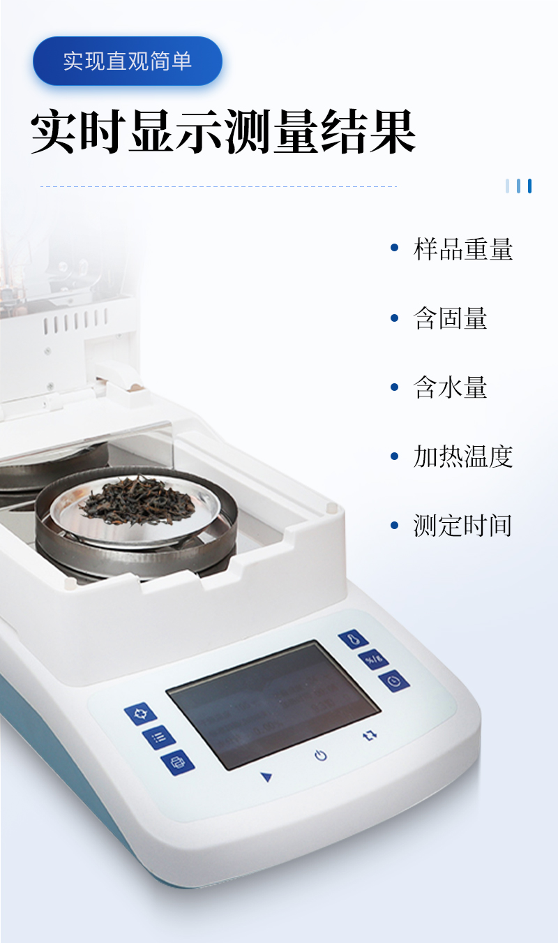 環(huán)狀的鹵素?zé)舸_保樣品得到均勻加熱,操作簡便、測量準(zhǔn)確。水分測定儀在測量樣品重量的同時,儀器采用環(huán)形管鹵素加熱方式,快速干燥樣品,在干燥過程中,水分儀持續(xù)測量并即時顯示樣品丟失的水分含量%,干燥程序完成后,*終測定的水分含量值被鎖定顯示。與國際烘箱加熱法相比,鹵素加熱可以在高溫下將樣品均勻地快速干燥,樣品表面不易受損,其檢測結(jié)果與國標(biāo)烘箱法具有良好的一致性,具有可替代性,且檢測效率遠(yuǎn)遠(yuǎn)高于烘箱法。智能化操作,一般樣品只需幾分鐘即可完成測定。該儀器操作簡單,測試準(zhǔn)確,顯示部分采用液晶顯示屏-使屏幕更加清晰明亮,示值清晰可見,分別可顯示水分值,樣品初值,終值,測定時間,溫度初值,*終值等數(shù)據(jù),并具有與計(jì)算機(jī),打印機(jī)連接功能、符合GLP規(guī)范的打印數(shù)據(jù)輸出。