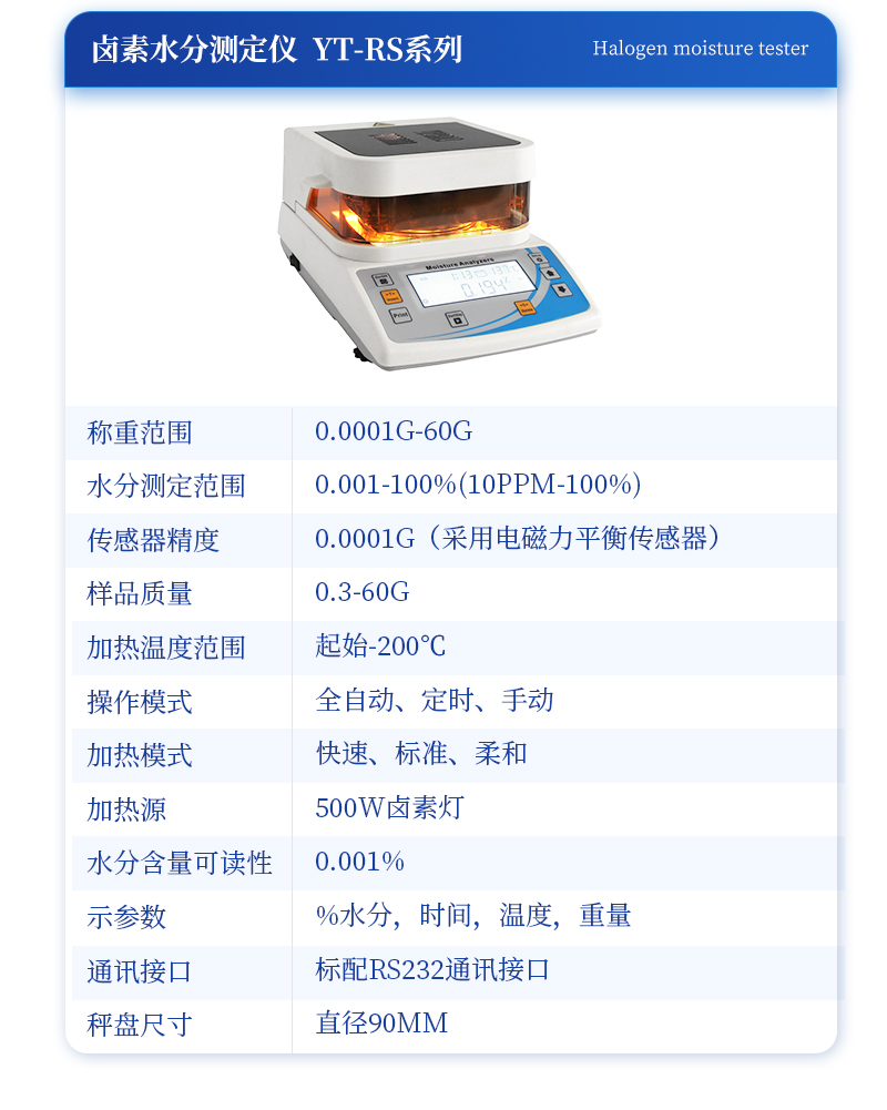 產(chǎn)品型號  Model:YT-LS1,**稱量  Range(g):50g,讀數(shù)精度  Readability(g): 0.005g,水分可讀精度  Moisturereadability:0.02%,干燥剩余可讀  Dryresidualreadability:0.02%產(chǎn)品型號  Model:YT-LS2,**稱量  Range(g):110g,讀數(shù)精度  Readability(g): 0.005g,水分可讀精度  Moisturereadability:0.02%,干燥剩余可讀  Dryresidualreadability:0.02%產(chǎn)品型號  Model:YT-LS3,**稱量  Range(g):110g,讀數(shù)精度  Readability(g): 0.002g,水分可讀精度  Moisturereadability:0.01%,干燥剩余可讀  Dryresidualreadability:0.01%產(chǎn)品型號  Model:YT-LS4,**稱量  Range(g):110g,讀數(shù)精度  Readability(g): 0.001g, 水分可讀精度  Moisturereadability :0.01%,干燥剩余可讀  Dryresidualreadability: 0.01%使用溫度  OperatingTemp.Range:5°C---35°C顯示屏  Display :觸摸液晶LCD校準(zhǔn)方式  Calibration:外部校準(zhǔn)  External秤盤尺寸  Pansize(mm): Φ90外觀尺寸  Dimensions(W*L*H) :200*180*380產(chǎn)品重量  Weight(Kg):5加熱方式  Heatsoure:鹵素?zé)? Halogenlamp溫度感應(yīng)器  Temp.sensor: PT-100溫度范圍  Temp.range:40°C---199°C溫度間隔  Temp.step:1°C水分范圍  Moisturerange :0.00%---100%干燥剩余范圍  Dryresidualrange:100.00%---0.00%ATRO:100%---999%ATRO:0%---999%溫度設(shè)定  Temperaturesetting:40°C---199°Cby1°Cstep時間設(shè)定  Timesetting:1---99min by 1s step自動停止  Autostop :0.1%---9.9%within 1min儲存歷史  Nuberofstorage:15加熱部分  Heater:220V+15% 50Hz115V+15%  400W連接部分:R232接口天平部分  Balance: External power supply  Output:9V   Lnput:220V+15%50Hz