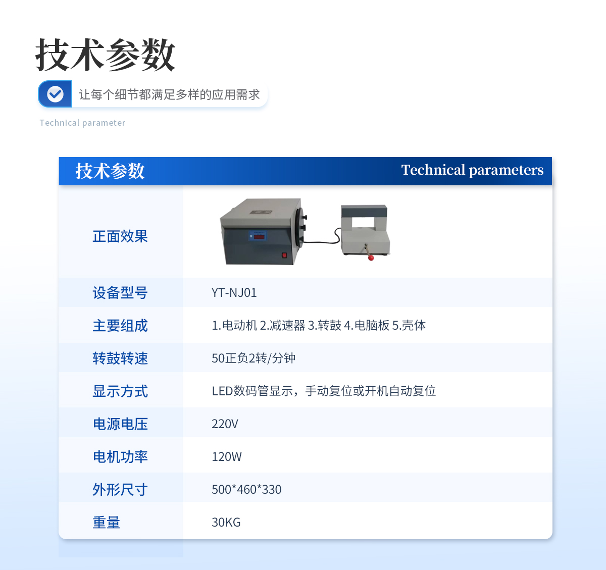 | 1.轉(zhuǎn)鼓轉(zhuǎn)速 50正負(fù)2轉(zhuǎn)/分鐘 | 2.顯示方式 LED數(shù)碼管顯示,手動復(fù)位或開機(jī)自動復(fù)位 | 3.電源電壓 220V | 4.電機(jī)功率 120W | 5.外形尺寸 500*460*330 | 6.重量 30KG |