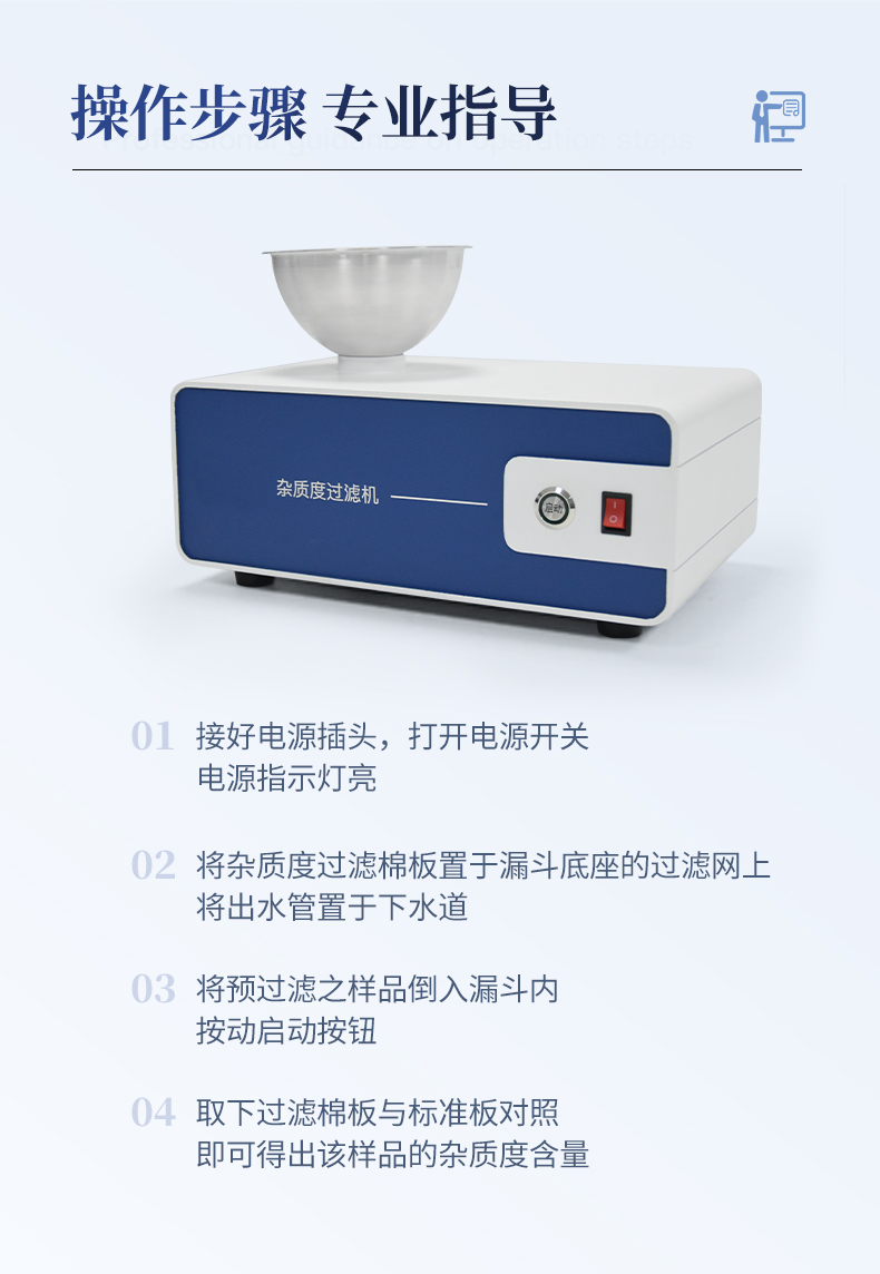 | 1. 接通電源,打開開關(guān)(指示燈亮)。 | 2. 將過濾棉板置于漏斗底座的過濾網(wǎng)上,出水管接入下水道。 | 3. 將樣品倒入漏斗,按下啟動按鈕進行過濾。 | 4. 過濾完成后取下棉板,與標準板對照,判斷雜質(zhì)度含量。 |