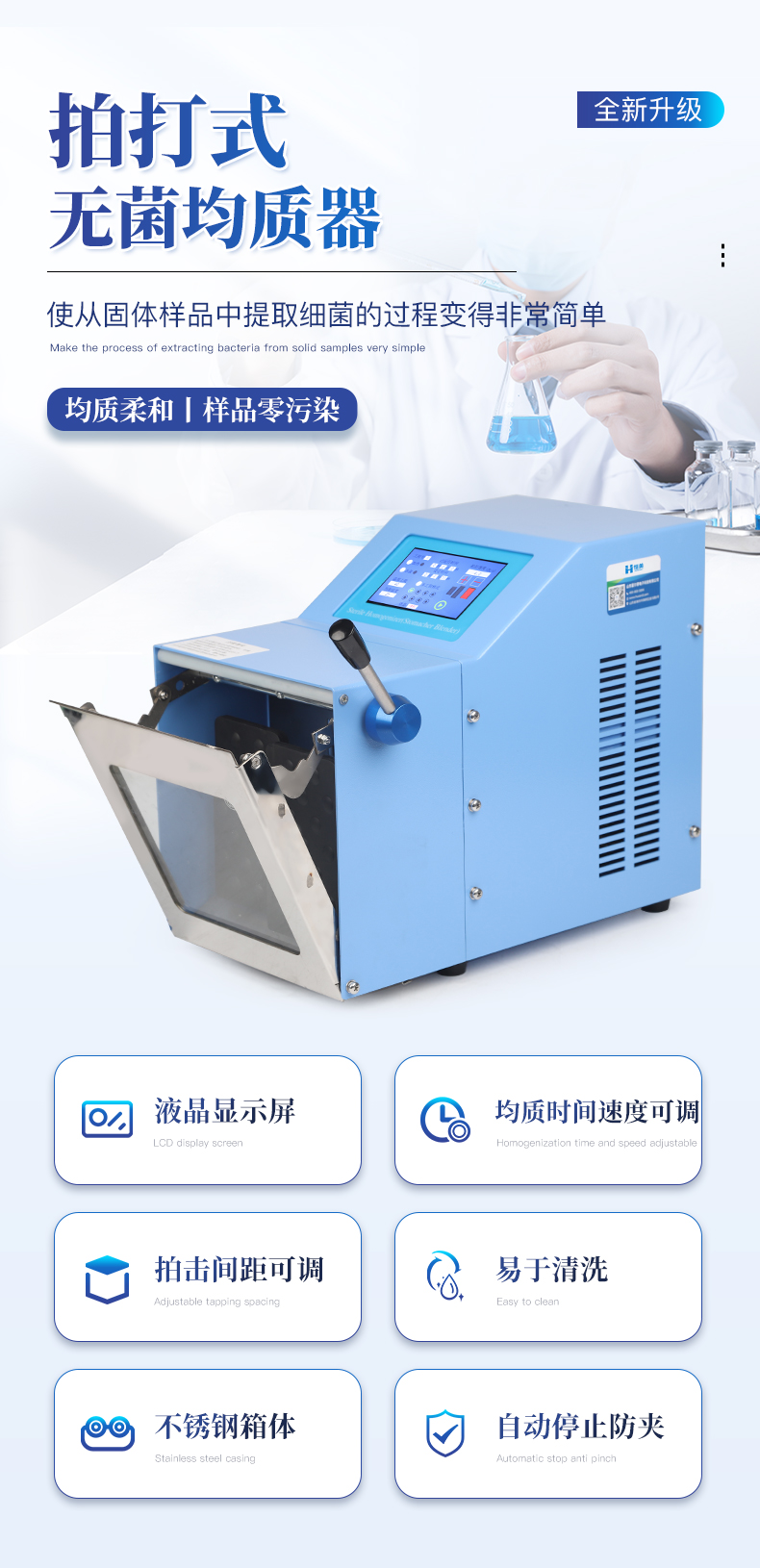 ●5英寸液晶顯示屏。    ●可儲存三組工作程序。    ●可調(diào)整的均質(zhì)時間。    ●均質(zhì)速度可調(diào)節(jié)或固定。    ●拍擊器可調(diào)整前后距離。    ●無菌一次性濾袋,保證衛(wèi)生。    ●全開啟式門,易于清洗。    ●玻璃透明窗口易于觀察 。    ●樣品與均質(zhì)儀無接觸,如無樣品泄露則不需進行系統(tǒng)清洗.    ●均質(zhì)柔和、樣品零污染、無損傷、不升溫、不需要滅菌處理,不需洗刷器皿。