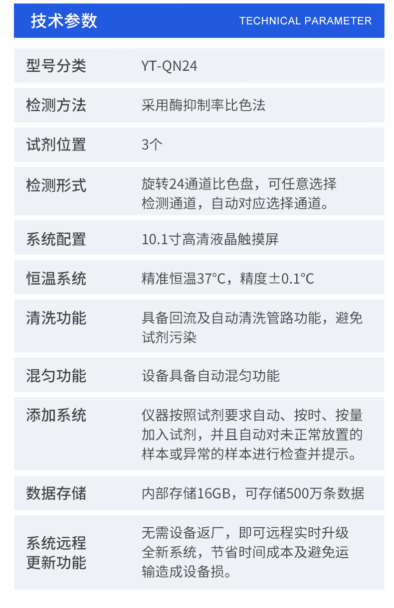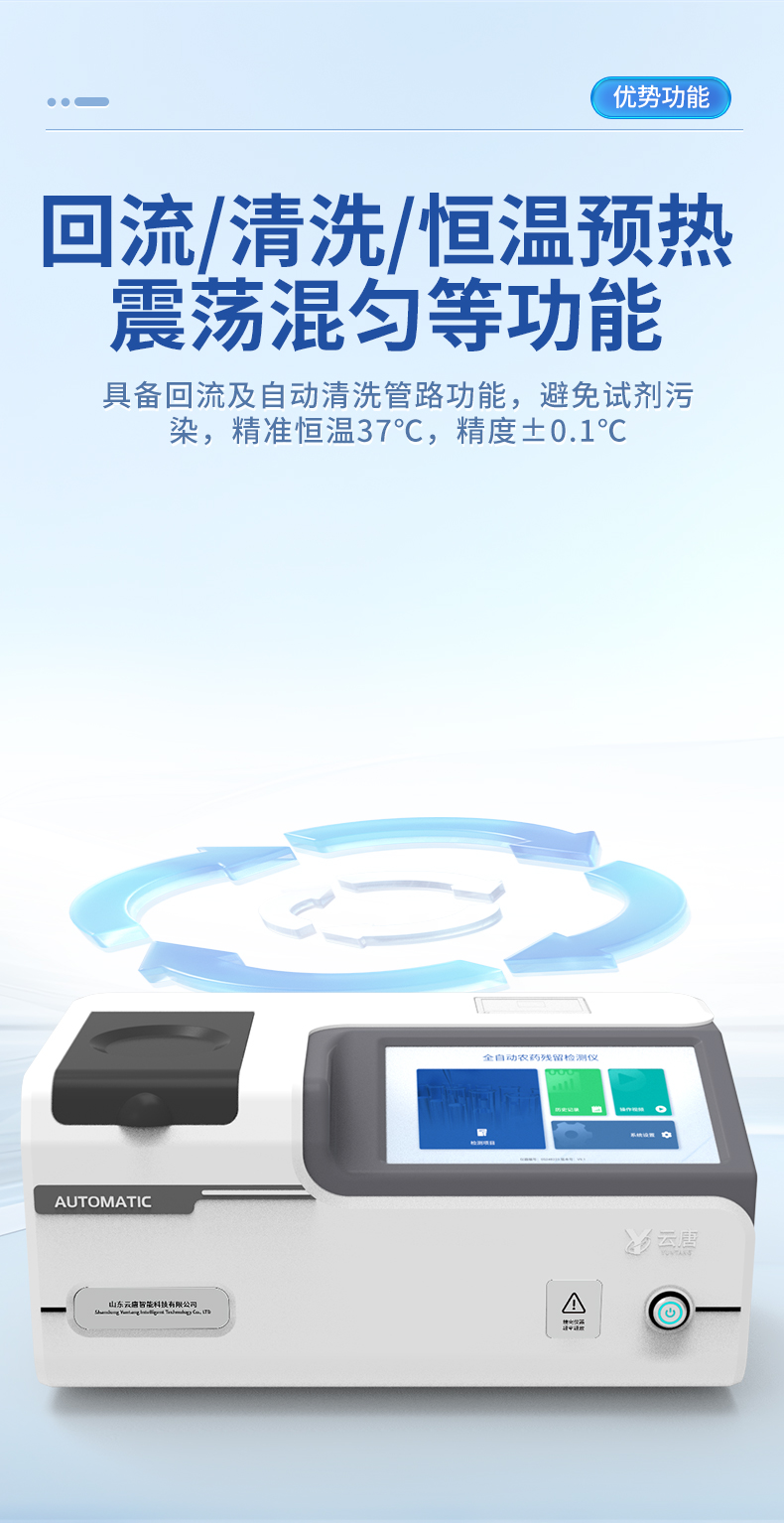 | 1. 試劑位置:3個 | 2. 檢測形式:旋轉(zhuǎn)24通道比色盤,可任意選擇檢測通道,自動對應(yīng)選擇通道。 | 3. 系統(tǒng)配置:10.1寸高清液晶觸摸屏,采用ARM Cortex?-A7,RK3288/4核處理器,運行內(nèi)存1GB。Android7.1.1 系統(tǒng)分辨率1280×800。 | 4.恒溫系統(tǒng):具有自動加溫溫控系統(tǒng),精準恒溫37℃,精度±0.1℃。 | 5.添加系統(tǒng):儀器按照試劑要求自動、按時、按量加入試劑,并且自動對未正常放置的樣本或異常的樣本進行檢查并提示。 | 6.清洗功能:儀器具備回流及自動清洗管路功能,避免試劑污染。 | 7.混勻功能:設(shè)備具備自動混勻功能。 | 8.光源校準:設(shè)備可自動校準,確保檢測準確度。 | 9.實時監(jiān)控:儀器測試過程中屏幕顯示運行狀態(tài),可實時查看。 | 10.數(shù)據(jù)存儲:內(nèi)部存儲16GB,可存儲500萬條數(shù)據(jù)。 | 11.樣品多選功能:設(shè)備具備樣品一鍵多選功能,選擇樣品自動匹配檢測通道。 | 12.項目預(yù)設(shè):可提前設(shè)置單個及多個相同或不相同的檢測任務(wù),可單次或者多次調(diào)取,減少檢測時間。 | 13.自定義打印系統(tǒng):內(nèi)置自定義打印系統(tǒng),可按需靈活設(shè)置開啟或關(guān)閉:產(chǎn)品合格證(國家農(nóng)業(yè)部標(biāo)準),二維碼,抽樣信息、檢測信息,受檢信息等信息的打印。 | 14.A4版本報告打印功能:設(shè)備可自動生成A4版報告,A4報告帶二維碼,可掃描二維碼生成電子版,并可識別真?zhèn)巍?/td> | 15.傳輸方式:儀器配備無線通信模塊: 4G(APN)通訊模塊、Wifi模塊,藍牙傳輸模塊,同時具有USB接口以及RJ45接口能以多種方式實現(xiàn)數(shù)據(jù)保存和數(shù)據(jù)傳輸功能,設(shè)備數(shù)據(jù)可以同步上傳至平臺。 | 16.數(shù)據(jù)監(jiān)管系統(tǒng):設(shè)備自帶監(jiān)管平臺,并可同步對接監(jiān)管平臺,數(shù)據(jù)可局域網(wǎng)和互聯(lián)網(wǎng)數(shù)據(jù)上傳,檢測結(jié)果可直接傳至食品安全監(jiān)管平臺。達到食品安全問題預(yù)估、預(yù)警。 | 17.系統(tǒng)遠程更新功能:無需設(shè)備返廠,即可遠程實時升級全新系統(tǒng),節(jié)省時間成本及避免運輸造成設(shè)備損。 |