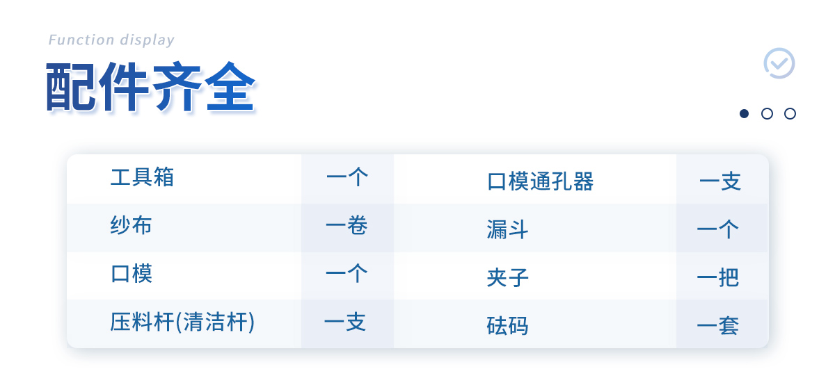 附件:工具箱一個(gè),紗布一卷,口模一個(gè),壓料桿(清潔桿)一支、口模通孔器一支.漏斗一個(gè).夾子一把.砝碼一套.