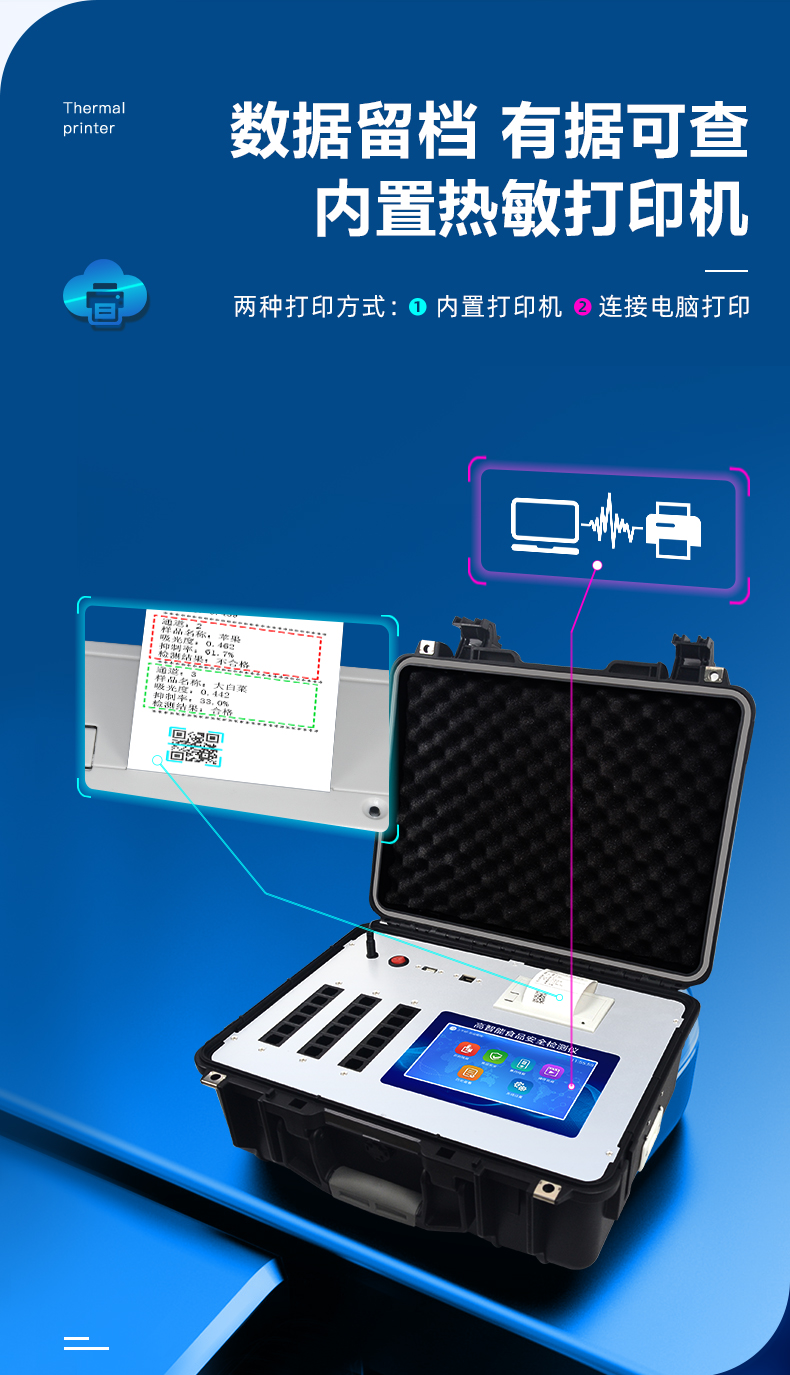 | 儀器采用手提式一體化系統(tǒng)檢測技術(shù),將分光光度模塊、膠體金檢測模塊、新型農(nóng)殘檢測模塊、數(shù)字化管理模塊、無線通訊模塊高度集成于一體,支持檢測200種食品安全檢測項(xiàng)目,同時(shí)預(yù)留升級檢測方法。 | 儀器檢測模塊標(biāo)準(zhǔn)化、智能化,檢測項(xiàng)目可隨意自由組合。檢測箱體內(nèi)置多個(gè)標(biāo)準(zhǔn)檢測單元,檢測模塊可以調(diào)整配置。 | 顯示屏幕:儀器采用10.1英寸豎向液晶觸摸屏顯,搭配運(yùn)行安卓智能操作系統(tǒng),主控芯片采用ARM Cortex-A7,RK3288/4核處理器,主頻1.88Ghz,操作方便,性能更強(qiáng)。 | 檢測通道:≥12通道;采用精密旋轉(zhuǎn)比色池設(shè)計(jì),使用同芯片同光源校準(zhǔn)精度,解決不同光源之間的誤差值,更加準(zhǔn)確**。(1-12通道間誤差0.1%,***:**202022821055.2) | 儀器光源:高精度進(jìn)口四波長冷光源,每個(gè)通道均配置 410、520、590、630nm 波長光源,標(biāo)配**的光路切換裝置,專利光路切換功能可實(shí)現(xiàn)64波長,并且所有檢測項(xiàng)目可實(shí)現(xiàn)所有通道同時(shí)檢測。 | 設(shè)備可一鍵校準(zhǔn),自動(dòng)保存校準(zhǔn)數(shù)據(jù),自動(dòng)對比校驗(yàn),得到精準(zhǔn)光源,采用Android SP存儲(chǔ)數(shù)據(jù),光源數(shù)據(jù)永不丟失,方便每一次使用。 | 通訊接口:配備無線通信模塊、4G(APN)通訊模塊、藍(lán)牙傳輸,同時(shí)具有雙USB接口以及RJ45網(wǎng)線接口,可以多方式實(shí)現(xiàn)數(shù)據(jù)保存及數(shù)據(jù)傳輸 | 存儲(chǔ)方式:支持U盤存儲(chǔ),標(biāo)準(zhǔn)USB接口,免驅(qū)動(dòng)安裝。檢測結(jié)果存儲(chǔ)容量20萬條以上,可生成Excel表格進(jìn)行拷貝,并具有登錄保護(hù)功能。 | 智能化操作系統(tǒng): | 1)操作系統(tǒng):儀器可在同一檢測界面自動(dòng)對應(yīng)相關(guān)檢測通道,一次性選擇1-12個(gè)樣品名稱,無需退出界面,節(jié)省操作時(shí)間。并可以對每個(gè)通道屬性和樣品信息單獨(dú)進(jìn)行編輯,例如送檢單位、人員,檢測人員等,打印時(shí)勾選打印顯示。 | 2)數(shù)據(jù)集成系統(tǒng):設(shè)備首頁自動(dòng)匯總分析檢測數(shù)據(jù),包含:周檢測數(shù)據(jù)、月檢測數(shù)據(jù),全部檢測總數(shù)量,均包含檢測總數(shù),合格數(shù),不合格數(shù),以及相關(guān)柱形分析圖,各項(xiàng)檢測數(shù)據(jù)一目了然,無需電腦查詢,更加快捷直觀。 | 3)數(shù)據(jù)庫系統(tǒng):十幾項(xiàng)數(shù)據(jù)庫分類管理儀器:包含項(xiàng)目類型、項(xiàng)目數(shù)據(jù)、檢測數(shù)據(jù)、歷史記錄、國標(biāo)信息、曲線信息、采樣信息、檢測信息、受檢信息、復(fù)核信息、圖表信息、光源校準(zhǔn)信息、打印樣式信息、樣品庫信息等等,數(shù)據(jù)庫之間互相協(xié)調(diào)聯(lián)動(dòng)保證數(shù)據(jù)的真實(shí)完整性。同時(shí)產(chǎn)品數(shù)據(jù)庫以及歷史檢測記錄支持一鍵檢索功能。 | 4)限量規(guī)判系統(tǒng):具有限量查詢、添加物質(zhì)合規(guī)判定系統(tǒng)。檢測出結(jié)果后,系統(tǒng)自動(dòng)調(diào)用系統(tǒng)數(shù)據(jù)庫中相關(guān)國標(biāo)進(jìn)行比對判定,客觀顯示判定結(jié)果是否合格。 | 5)項(xiàng)目預(yù)設(shè)系統(tǒng):儀器具有任務(wù)預(yù)設(shè)模塊,一鍵提前預(yù)設(shè),給出方便快捷的新檢測方案,每一個(gè)任務(wù)分別可以設(shè)置不同的樣品、批次、編號、來源、備注、抽樣信息、檢測信息、受檢信息、復(fù)核信息等更多信息。樣品送檢時(shí)一鍵調(diào)取保存信息,并可多次調(diào)取,大大提高檢測效率。 | 6)數(shù)據(jù)監(jiān)管系統(tǒng):同步對接監(jiān)管平臺,數(shù)據(jù)可局域網(wǎng)和互聯(lián)網(wǎng)數(shù)據(jù)上傳,檢測結(jié)果可選擇直接傳至食品安全監(jiān)管平臺。進(jìn)行區(qū)域食品安全監(jiān)管及大數(shù)據(jù)分析處理與數(shù)據(jù)統(tǒng)計(jì),檢測區(qū)域食品安全長短期動(dòng)態(tài),達(dá)到食品安全問題預(yù)估、預(yù)警。 | 7)打印系統(tǒng):內(nèi)置全新打印機(jī),新創(chuàng)自定義打印方式,可按需靈活勾選控制:產(chǎn)品合格證(國家農(nóng)業(yè)部標(biāo)準(zhǔn)要求),二維碼,抽樣信息、檢測信息,受檢信息、復(fù)核信息、抽樣日期、檢測日期等信息的打印。 | 供電模式:儀器交直流兩用,直流12V供電,可連接車載電源,可配6ah大容量充電鋰電池,電量可實(shí)時(shí)顯示,方便戶外流動(dòng)測試。 | 膠體金檢測模塊:采用雙通道CMOS成像處理技術(shù)及膠體金免疫層析技術(shù),可同時(shí)讀取雙膠體金卡數(shù)據(jù),自動(dòng)采集、處理分析,將檢測結(jié)果顯示,并可根據(jù)參考限值自動(dòng)判斷檢測結(jié)果,可檢測常見的獸藥殘留、生物毒素、抗生素、違禁添加物等。 | 1)探測技術(shù):CMOS成像探測; | 2)檢測通道:1個(gè)通道; | 3)檢測方式:消線法和比色法; | 4)顯示模式:陰性或陽性; | 5)曲線形式:軌道式掃描方式,顯示金標(biāo)卡圖像,實(shí)時(shí)生成、識別CT曲線圖,無需手動(dòng)調(diào)整,完成檢測后自動(dòng)退出檢測卡。兼容市場上其他金標(biāo)卡,使用耗材不受限制。 | 儀器加入遠(yuǎn)程升級功能,可定向分客戶分儀器更新,開機(jī)后自動(dòng)更新,客戶無需任何