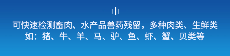 食品添加劑:二氧化硫、雙氧水、亞硝酸鹽、硝酸鹽、苯甲酸鈉、山梨酸鉀、糖精鈉、甜蜜素、木耳硫酸鎂等有毒有害物質(zhì):甲醛、吊白塊、硼砂、過氧化苯甲酰、溴酸鉀、羅丹明B、三聚氰胺、蘇丹紅、工業(yè)堿、尿素、明礬等果蔬:農(nóng)藥殘留(酶抑制率法)病害肉:組胺、揮發(fā)性鹽基氮重金屬含量:鉛、鎘、鉻、汞、砷、錫、鎳、鋁等水產(chǎn)品安全類:孔雀石綠、氯霉素、呋喃妥因、呋喃西林、呋喃它酮、呋喃唑酮等瘦肉精激素類(獸藥):鹽酸克倫特羅、沙丁胺醇、萊克多巴胺、己烯雌酚等抗生素殘留:四環(huán)素類、硝基呋喃類、磺胺類、β-興奮劑類、沙星類、磺胺類、喹諾酮類,甲砜霉素,氟苯尼考,金剛烷胺、替米考星、慶大霉素、林可霉素、鏈霉素、恩諾沙星、環(huán)丙沙星、頭孢啦啶、青霉素、阿莫西林等真菌毒素類:食用油、糧食及飼料中黃曲霉毒素B1、黃曲霉毒素總量,奶中黃曲霉毒素M1、嘔吐毒素、玉米赤霉烯酮、赭曲霉毒素A、T2毒素、伏馬毒素等調(diào)味品成分: 食醋的總酸、醬油的總酸、芝麻油純度、谷氨酸鈉、醬油氨基酸態(tài)氮、食鹽中亞鐵氰化鉀、食鹽中碘等食用色素類:紅色色素(胭脂紅、莧菜紅、莧菜紅)、黃色色素(檸檬黃、日落黃)、藍(lán)色色素(亮藍(lán))等動物疫病類:禽流感、新城疫、牛羊口蹄疫、牛羊結(jié)核病、牛羊包蟲、牛羊布病、小反芻獸、豬藍(lán)耳病毒、豬瘟病毒、豬偽狂犬病毒、豬細(xì)小、豬圓環(huán)、犬細(xì)小病毒、犬瘟熱病毒、犬狂犬病毒等蜂蜜成分:果糖和葡萄糖、蔗糖、淀粉酶、酸度等食用油檢測:過氧化值、酸價等蛋類藥物殘留:氯霉素,四環(huán)素,磺胺類,喹諾酮類,呋喃西林,呋喃它酮,呋喃妥因,呋喃唑酮,氟苯尼考,阿莫西林、頭孢氨芐、紅霉素、鏈霉素等酒類及乳品牛奶中蛋白質(zhì):酒中甲醇、乙醇、乳品及牛奶中蛋白質(zhì)、乳品硫氰酸鈉、三聚氰胺,