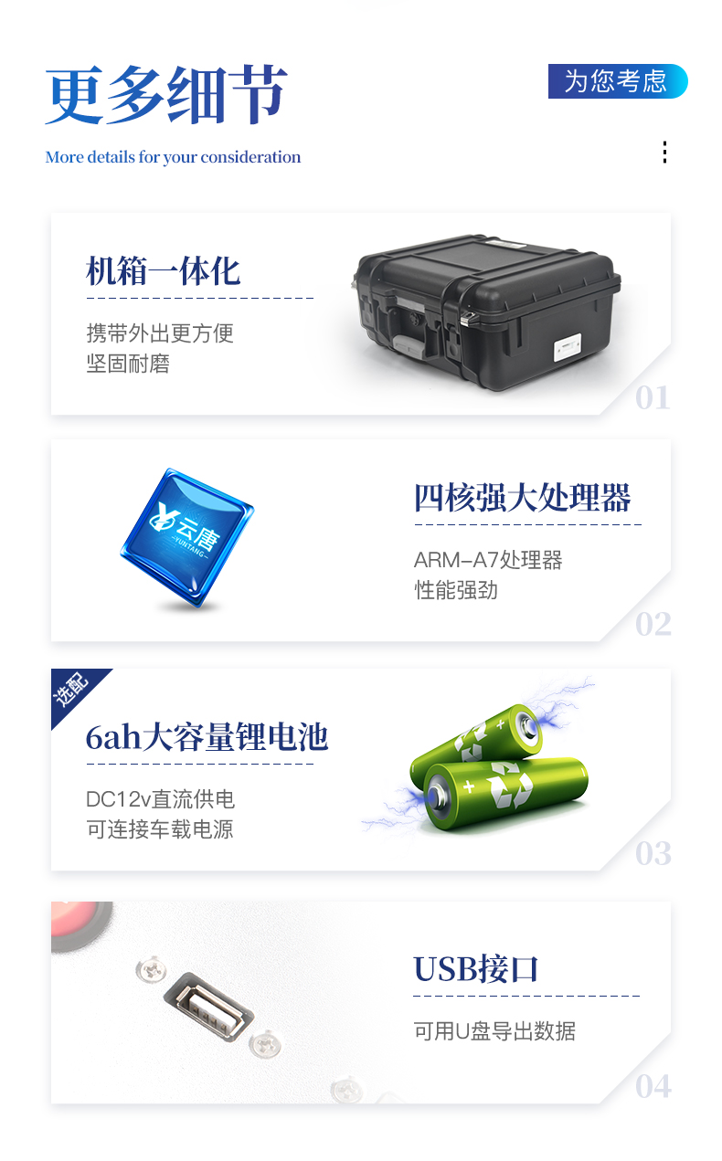 | 主控芯片采用ARM Cortex-A7,RK3288/4核處理器,主頻1.88Ghz,運轉速度更快速,穩(wěn)定性更強。 | 顯示方式:7英寸液晶觸摸屏顯示,人性化中文操作界面,讀數(shù)直觀、簡單。 | 交直流兩用,直流12V供電,可連接車載電源,可配6ah大容量充電鋰電池,方便戶外流動測試。 | 四波長冷光源,每個通道均配置410、520、590、630nm波長光源,標配**的光路切換裝置,專利光路切換功能可實現(xiàn)*多64波長,并且所有檢測項目可實現(xiàn)所有通道同時檢測。 | 光源亮度自動調節(jié)與校準 | 智能恒流穩(wěn)壓,光強自動校準,長時間連續(xù)工作光源無溫漂現(xiàn)象。 | 內置新國家限量標準,與所測結果進行現(xiàn)場比對,并持續(xù)更新標準。 | 不間斷進樣,連續(xù)檢測 | 樣本編號自動累加。 | 數(shù)據(jù)無線上傳平臺,并可從平臺導出為Excel表格。 | 檢測結果存儲容量20萬條 | 同時支持U盤拷貝,標準USB接口,免驅動插拔。 | 檢測項目可擴充,固件可升級 | 儀器尺寸:43×35×20cm, 主機凈重:5.2kg |