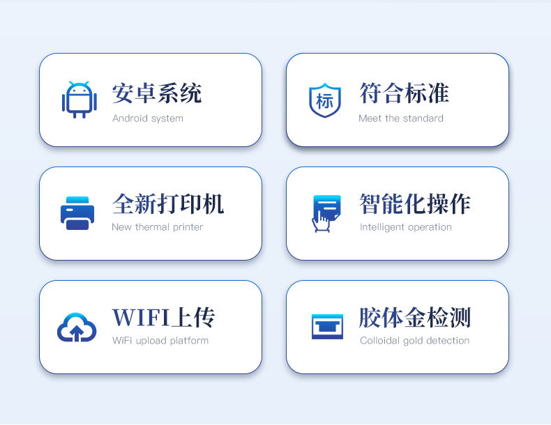 | 安卓智能操作系統(tǒng),采用更加**UI交互界面,儀器具有wifi聯(lián)網(wǎng)上傳、4G聯(lián)網(wǎng)傳輸、GPRS無線遠(yuǎn)傳、網(wǎng)線連接功能,快速批量上傳數(shù)據(jù)。 | 智能化程度高,儀器具有自檢功能:具有開機(jī)自檢和調(diào)零功能,具有自動檢測重復(fù)性功能。 | 新一代高速熱敏打印機(jī),檢測完成可自動打印檢測報告和二維碼。 | 儀器帶有監(jiān)管平臺,數(shù)據(jù)可局域網(wǎng)和互聯(lián)網(wǎng)數(shù)據(jù)上傳,檢測結(jié)果直接傳至食品安全監(jiān)管平臺。進(jìn)行區(qū)域食品安全監(jiān)管及大數(shù)據(jù)分析處理與數(shù)據(jù)統(tǒng)計,檢測區(qū)域食品安全長短期動態(tài),達(dá)到食品安全問題預(yù)估、預(yù)警 | 一體化便攜式快檢設(shè)備,滿足現(xiàn)場及流動檢測使用需求,能夠在同一軟件下實(shí)現(xiàn)所有檢測項目的檢測,并可通過同一窗口直觀顯示檢測結(jié)果。 | 膠體金模塊檢測方式:軌道式自動傳輸掃描,檢測完成后自動退出檢測卡。 | 一體化主機(jī),包含食品安全檢測模塊、多通道農(nóng)藥殘留檢測模塊、膠體金免疫層析檢測模塊。 | CT線自動識別,無需手動調(diào)整。 | 儀器具有品類多種類樣品菜單庫,可靈活選擇檢測樣品,不同的檢測通道可同時檢測不同的樣品項目。。 | 樣品處理簡單省力,整體操作快速、安全、便捷。 | 儀器具有自身保護(hù)功能,可設(shè)置用戶名及密碼,防止非工作人員操作等。 | 高靈敏度,高檢測精度,高重復(fù)性精度,掃描式高精度光學(xué)傳感器。 | 儀器具有重新校準(zhǔn)、鎖定、恢復(fù)出廠設(shè)置功能。 | 內(nèi)置強(qiáng)大的數(shù)據(jù)庫,可在儀器上直接選擇樣品名稱、檢測指標(biāo)、送檢單位等信息,也可在儀器上直接編輯錄入樣品名稱、檢測指標(biāo)、送檢單位等信息并保存進(jìn)樣品數(shù)據(jù)庫。 | 儀器具有重新校準(zhǔn)、鎖定、恢復(fù)出廠設(shè)置功能。 | 結(jié)果判定線可修改,對照值標(biāo)定值可保存,斷電不丟失數(shù)據(jù)。 | 兼容市場上所有的膠體金卡,使用耗材不受限制,極大增強(qiáng)用戶使用體驗。 |