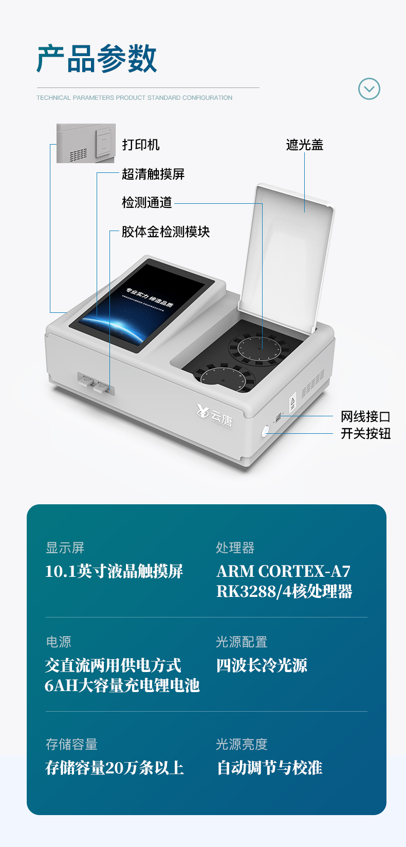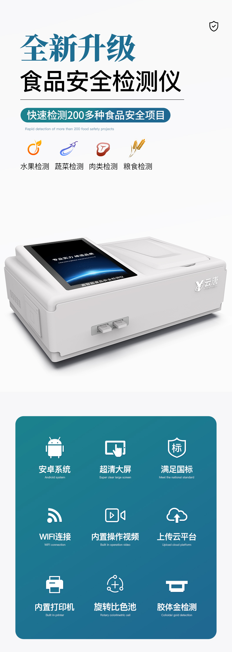 1、儀器采用臺式一體化系統(tǒng)檢測技術,將分光光度模塊、膠體金檢測模塊、新型農殘檢測模塊、數(shù)字化管理模塊、無線通訊模塊高度集成于一體,支持檢測200種食品安全檢測項目,同時預留升級檢測方法。2、儀器檢測模塊標準化、智能化,檢測項目可隨意自由組合。檢測箱體內置多個標準檢測單元,檢測模塊可以調整配置。3、顯示屏幕:儀器采用10.1英寸豎向液晶觸摸屏顯,搭配運行安卓智能操作系統(tǒng),主控芯片采用ARM Cortex-A7,RK3288/4核處理器,主頻1.88Ghz,操作方便,性能更強。4、檢測通道:≥12通道;采用精密旋轉比色池設計,使用同芯片同光源校準精度,解決不同光源之間的誤差值,更加準確**。(1-12通道間誤差0.1%,***:**202022821055.2)5、儀器光源:高精度進口四波長冷光源,每個通道均配置 410、520、590、630nm 波長光源,標配**的光路切換裝置,專利光路切換功能可實現(xiàn)64波長,并且所有檢測項目可實現(xiàn)所有通道同時檢測。6、設備可一鍵校準,自動保存校準數(shù)據(jù),自動對比校驗,得到精準光源,采用Android SP存儲數(shù)據(jù),光源數(shù)據(jù)永不丟失,方便每一次使用。7、通訊接口:配備無線通信模塊、4G(APN)通訊模塊、藍牙傳輸,同時具有雙USB接口以及RJ45網(wǎng)線接口,可以多方式實現(xiàn)數(shù)據(jù)保存及數(shù)據(jù)傳輸。8、存儲方式:支持U盤存儲,標準USB接口,免驅動安裝。檢測結果存儲容量20萬條以上,可生成Excel表格進行拷貝,并具有登錄保護功能。9、智能化操作系統(tǒng):9.1、操作系統(tǒng):儀器可在同一檢測界面自動對應相關檢測通道,一次性選擇1-12個樣品名稱,無需退出界面,節(jié)省操作時間。并可以對每個通道屬性和樣品信息單獨進行編輯,例如送檢單位、人員,檢測人員等,打印時勾選打印顯示。9.2、數(shù)據(jù)集成系統(tǒng):設備首頁自動匯總分析檢測數(shù)據(jù),包含:周檢測數(shù)據(jù)、月檢測數(shù)據(jù),全部檢測總數(shù)量,均包含檢測總數(shù),合格數(shù),不合格數(shù),以及相關柱形分析圖,各項檢測數(shù)據(jù)一目了然,無需電腦查詢,更加快捷直觀。9.3、數(shù)據(jù)庫系統(tǒng):十幾項數(shù)據(jù)庫分類管理儀器:包含項目類型、項目數(shù)據(jù)、檢測數(shù)據(jù)、歷史記錄、國標信息、曲線信息、采樣信息、檢測信息、受檢信息、復核信息、圖表信息、光源校準信息、打印樣式信息、樣品庫信息等等,數(shù)據(jù)庫之間互相協(xié)調聯(lián)動保證數(shù)據(jù)的真實完整性。同時產品數(shù)據(jù)庫以及歷史檢測記錄支持一鍵檢索功能。9.4、限量規(guī)判系統(tǒng):具有限量查詢、添加物質合規(guī)判定系統(tǒng)。檢測出結果后,系統(tǒng)自動調用系統(tǒng)數(shù)據(jù)庫中相關國標進行比對判定,客觀顯示判定結果是否合格。9.5、項目預設系統(tǒng):儀器具有任務預設模塊,一鍵提前預設,給出方便快捷的新檢測方案,每一個任務分別可以設置不同的樣品、批次、編號、來源、備注、抽樣信息、檢測信息、受檢信息、復核信息等更多信息。樣品送檢時一鍵調取保存信息,并可多次調取,大大提高檢測效率。9.6、數(shù)據(jù)監(jiān)管系統(tǒng):同步對接監(jiān)管平臺,數(shù)據(jù)可局域網(wǎng)和互聯(lián)網(wǎng)數(shù)據(jù)上傳,檢測結果可選擇直接傳至食品安全監(jiān)管平臺。進行區(qū)域食品安全監(jiān)管及大數(shù)據(jù)分析處理與數(shù)據(jù)統(tǒng)計,檢測區(qū)域食品安全長短期動態(tài),達到食品安全問題預估、預警。9.7.1、全新打印系統(tǒng):內置全新打印機,新創(chuàng)自定義打印方式,可按需靈活勾選控制:產品合格證(國家農業(yè)部標準要求),二維碼,抽樣信息、檢測信息,受檢信息、復核信息、抽樣日期、檢測日期等信息的打印。9.7.2、A4紙版本報告打印功能(選配):設備擁有兩種結果展示方式,可以自動生成A4打印模板和小票打印模板兩種樣式,可通過WiFi及網(wǎng)線等方式鏈接外置打印機可進行打印。10、供電模式:儀器交直流兩用,直流12V供電,可連接車載電源,可配6ah大容量充電鋰電池,電量可實時顯示,方便戶外流動測試。11、膠體金檢測模塊:采用單通道CMOS成像處理技術及膠體金免疫層析技術,可讀取膠體金卡數(shù)據(jù),自動采集、處理分析,將檢測結果顯示,并可根據(jù)參考限值自動判斷檢測結果,可檢測常見的獸藥殘留、生物毒素、抗生素、違禁添加物等。11.1、探測技術:CMOS成像探測;11.2、檢測通道:1個通道;11.3、檢測方式:消線法和比色法;11.4、顯示模式:陰性或陽性;11.5、曲線形式:直插式掃描方式,顯示金標卡圖像,實時生成、識別CT曲線圖,無需手動調整,完成檢測后自動退出檢測卡。兼容市場上其他金標卡,使用耗材不受限制。12、儀器具備遠程升級功能,可定向分客戶分儀器更新,開機后自動更新,并可持續(xù)性免費更新系統(tǒng)版本,無需像傳統(tǒng)產品返廠更新,節(jié)省時間及人力成本并避免了物流運輸返廠升級導致設備損壞的潛在風險。