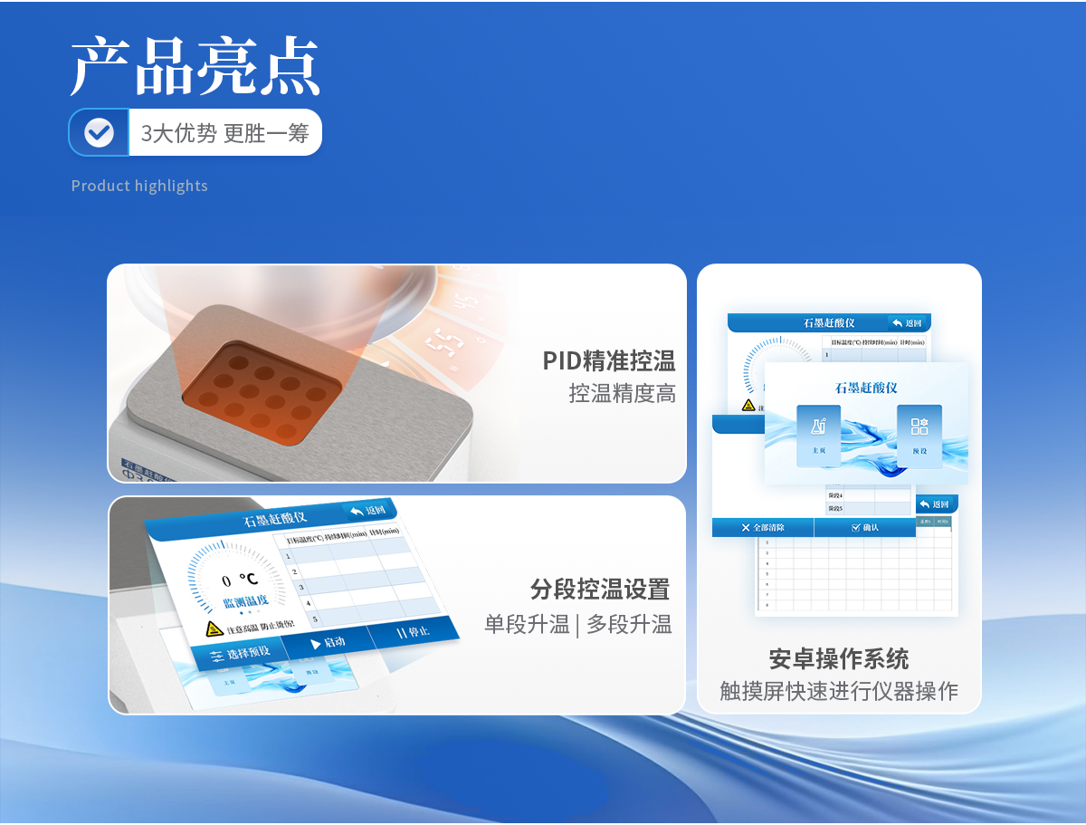 使用5寸彩色觸摸屏進行儀器操作,配備安卓操作系統(tǒng),方便快捷。 采用PID 控溫技術,控溫精度高,升溫速度快, 從室溫到260℃僅需25分鐘。 分段控溫設置,即可單段升溫,也可多段升溫,設置靈活,儀器將自動按順序完成。更適于易產(chǎn)生泡沫的樣品。 采用優(yōu)質石墨爐內(nèi)芯,平均溫差較小,樣品效果一致性好,熱傳導效率更高。石墨塊具有特氟龍涂層,耐腐蝕,延長使用壽命。