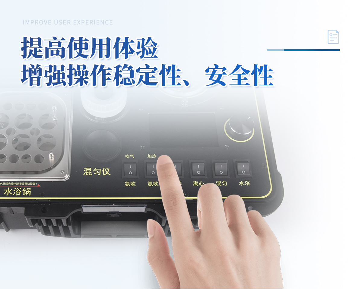 | 1、功能緊湊,集成五種樣品前處理常用的功能,完成樣品一站式處理。 | 2、結(jié)構(gòu)穩(wěn)固,機(jī)箱采用***工程塑料,具備**的抗沖擊性、耐腐蝕性、便攜性。 | 3、操作穩(wěn)定,機(jī)器采用五寸全彩色液晶屏,功能指示性強(qiáng),用戶操作均為實(shí)體開關(guān),杜絕佩戴手套和液體噴濺時(shí)的操作失效。 |