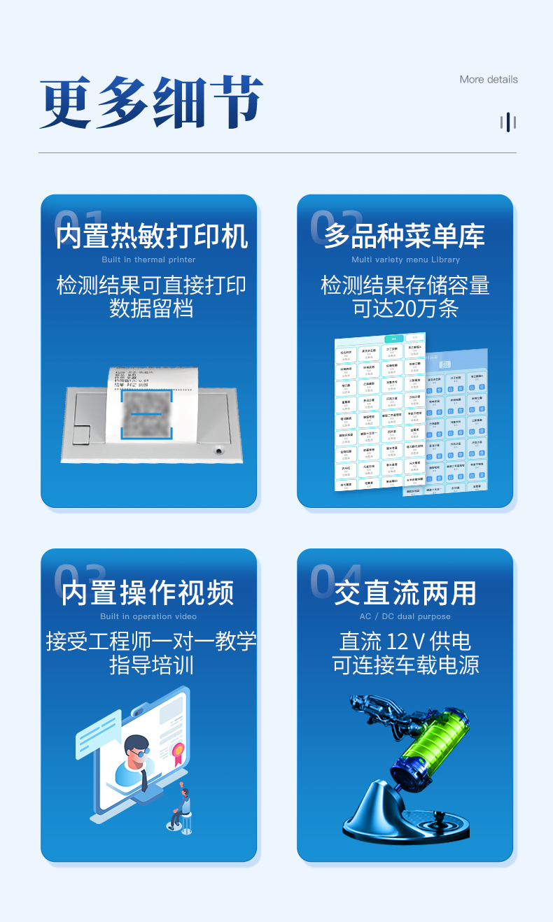 | 1、儀器采用臺式一體化系統(tǒng)檢測技術(shù),將分光光度模塊、數(shù)字化管理模塊、無線通訊模塊高度集成于一體,支持檢測幾十種食品安全檢測項目,同時預(yù)留升級檢測方法。 | 2、儀器檢測模塊標(biāo)準(zhǔn)化、智能化,檢測項目可隨意自由組合。檢測箱體內(nèi)置多個標(biāo)準(zhǔn)檢測單元,檢測模塊可以調(diào)整配置。 | 3、顯示屏幕:儀器采用7英寸液晶觸摸屏,搭配運行安卓智能操作系統(tǒng),主控芯片采用ARM Cortex-A7,RK3288/4核處理器,主頻1.88Ghz,操作方便,性能更強(qiáng)。 | 4、檢測通道:≥12通道;采用精密旋轉(zhuǎn)比色池設(shè)計,使用同芯片同光源校準(zhǔn)精度,解決不同光源之間的誤差值,更加準(zhǔn)確**。 | 5、儀器光源:高精度進(jìn)口四波長冷光源,每個通道均配置 410、520、590、630nm 波長光源,標(biāo)配**的光路切換裝置,專利光路切換功能可實現(xiàn)64波長,并且所有檢測項目可實現(xiàn)所有通道同時檢測。 | 6、通訊接口:配備無線通信模塊、可選配4G(APN)通訊模塊和藍(lán)牙傳輸,同時具有USB接口,可以多方式實現(xiàn)數(shù)據(jù)保存及數(shù)據(jù)傳輸。 | 7、存儲方式:支持U盤存儲,標(biāo)準(zhǔn)USB接口,免驅(qū)動安裝。檢測結(jié)果存儲容量20萬條以上,可生成Excel表格進(jìn)行拷貝,并具有登錄保護(hù)功能。 | 8、智能化操作系統(tǒng) | 8.1、操作系統(tǒng):儀器可在同一檢測界面自動對應(yīng)相關(guān)檢測通道,一次性選擇1-12個樣品名稱,無需退出界面,節(jié)省操作時間。并可以對每個通道屬性和樣品信息單獨進(jìn)行編輯,例如送檢單位、人員,檢測人員等,打印時勾選打印顯示。 | 8.2、限量規(guī)判系統(tǒng):具有限量查詢、添加物質(zhì)合規(guī)判定系統(tǒng)。檢測出結(jié)果后,系統(tǒng)自動調(diào)用系統(tǒng)數(shù)據(jù)庫中相關(guān)國標(biāo)進(jìn)行比對判定,客觀顯示結(jié)果是否合格。 | 8.3、數(shù)據(jù)監(jiān)管系統(tǒng):同步對接監(jiān)管平臺,數(shù)據(jù)可局域網(wǎng)和互聯(lián)網(wǎng)數(shù)據(jù)上傳,檢測結(jié)果可選擇直接傳至食品安全監(jiān)管平臺。進(jìn)行區(qū)域食品安全監(jiān)管及大數(shù)據(jù)分析處理與數(shù)據(jù)統(tǒng)計,檢測區(qū)域食品安全長短期動態(tài),達(dá)到食品安全問題預(yù)估、預(yù)警。 | 8.4、打印系統(tǒng):內(nèi)置全新打印機(jī),可以打?。喉椖棵Q,二維碼,抽樣信息、檢測信息,受檢信息、復(fù)核信息、抽樣日期、檢測日期等信息的打印。 | 9、供電模式:儀器交直流兩用,直流12V供電(標(biāo)配),可連接車載電源,亦可選配6ah大容量充電鋰電池,電量可實時顯示,方便戶外流動測試。 | 10、儀器具有重新校準(zhǔn)、鎖定、恢復(fù)出廠設(shè)置功能, | 11、外觀尺寸:415X310X150(mm) ,并可加配鋁合金手提箱 |