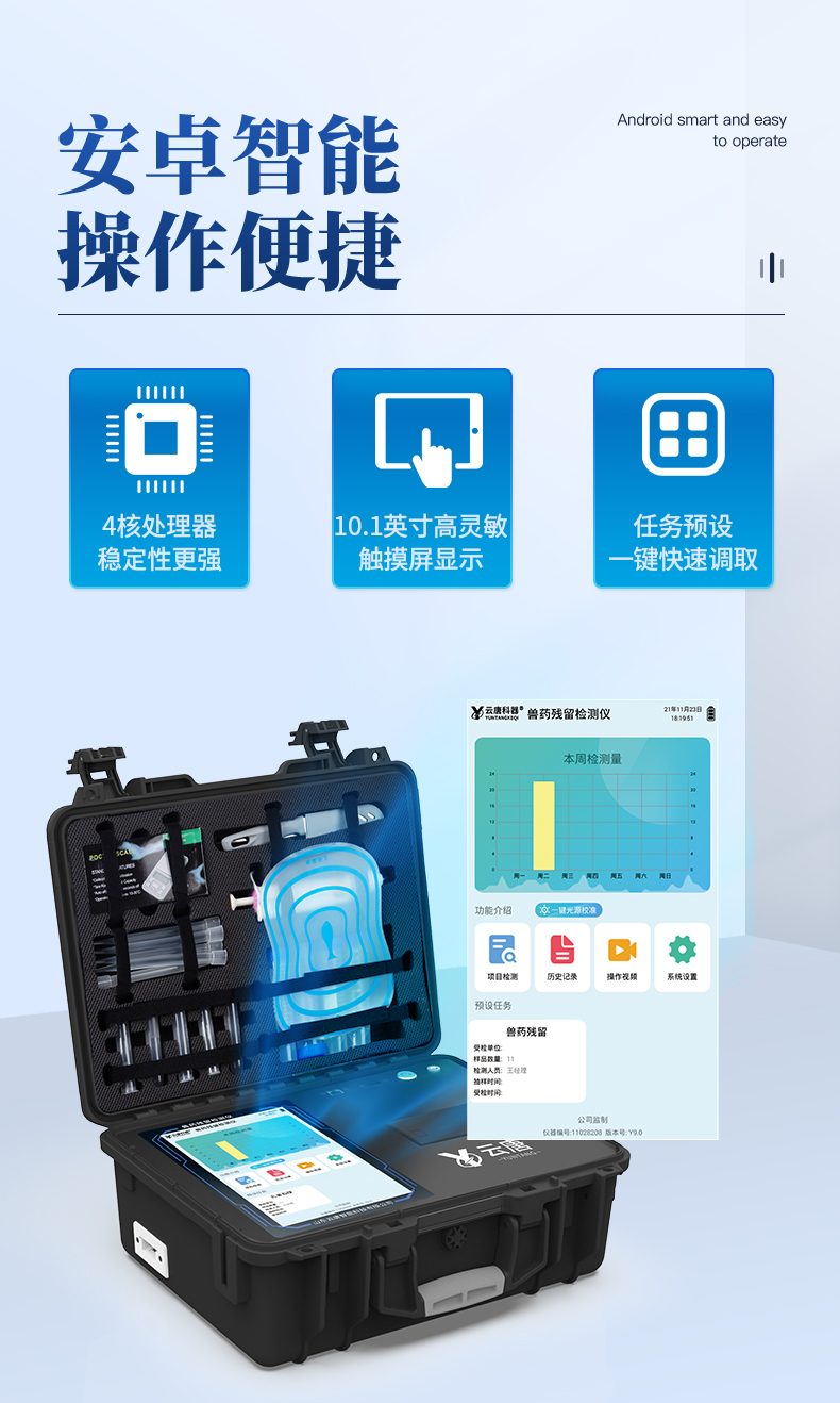 儀器采用手提一體化系統(tǒng)檢測技術,將分光光度模塊、數字化管理模塊、無線通訊模塊高度集成于一體,可支持檢測60種食品安全檢測項目,同時預留升級檢測方法。儀器檢測模塊標準化、智能化,檢測項目可隨意自由組合。檢測箱體內置多個標準檢測單元,檢測模塊可以調整配置。顯示屏幕:儀器采用10.1英寸豎向液晶觸摸屏顯,搭配運行安卓智能操作系統(tǒng),主控芯片采用ARM Cortex-A7,RK3288/4核處理器,主頻1.88Ghz,操作方便,性能更強。檢測通道:≥12通道;采用精密旋轉比色池設計,使用同芯片同光源校準精度,解決不同光源之間的誤差值,更加準確**。(1-12通道間誤差0.1%,***:**202022821055.2)儀器光源:高精度進口四波長冷光源,每個通道均配置 410、520、590、630nm 波長光源,標配**的光路切換裝置,專利光路切換功能可實現64波長,并且所有檢測項目可實現所有通道同時檢測。設備可一鍵校準,自動保存校準數據,自動對比校驗,得到精準光源,采用Android SP存儲數據,光源數據永不丟失,方便每一次使用。通訊接口:配備無線通信模塊、4G(APN)通訊模塊、藍牙傳輸,同時具有雙USB接口以及RJ45網線接口,可以多方式實現數據保存及數據傳輸。存儲方式:支持U盤存儲,標準USB接口,免驅動安裝。檢測結果存儲容量20萬條以上,可生成Excel表格進行拷貝,并具有登錄保護功能。智能化操作系統(tǒng):1、操作系統(tǒng):儀器可在同一檢測界面自動對應相關檢測通道,一次性選擇1-12個樣品名稱,無需退出界面,節(jié)省操作時間。并可以對每個通道屬性和樣品信息單獨進行編輯,例如送檢單位、人員,檢測人員等,打印時勾選打印顯示。2、數據集成系統(tǒng):設備首頁自動匯總分析檢測數據,包含:周檢測數據、月檢測數據,全部檢測總數量,均包含檢測總數,合格數,不合格數,以及相關柱形分析圖,各項檢測數據一目了然,無需電腦查詢,更加快捷直觀。3、數據庫系統(tǒng):十幾項數據庫分類管理儀器:包含項目類型、項目數據、檢測數據、歷史記錄、國標信息、曲線信息、采樣信息、檢測信息、受檢信息、復核信息、圖表信息、光源校準信息、打印樣式信息、樣品庫信息等等,數據庫之間互相協(xié)調聯(lián)動保證數據的真實完整性。同時產品數據庫以及歷史檢測記錄支持一鍵檢索功能。4、限量規(guī)判系統(tǒng):具有限量查詢、添加物質合規(guī)判定系統(tǒng)。檢測出結果后,系統(tǒng)自動調用系統(tǒng)數據庫中相關國標進行比對判定,客觀顯示判定結果是否合格。5、項目預設系統(tǒng):儀器具有任務預設模塊,一鍵提前預設,給出方便快捷的新檢測方案,每一個任務分別可以設置不同的樣品、批次、編號、來源、備注、抽樣信息、檢測信息、受檢信息、復核信息等更多信息。樣品送檢時一鍵調取保存信息,并可多次調取,大大提高檢測效率。6、數據監(jiān)管系統(tǒng):同步對接監(jiān)管平臺,數據可局域網和互聯(lián)網數據上傳,檢測結果可選擇直接傳至食品安全監(jiān)管平臺。進行區(qū)域食品安全監(jiān)管及大數據分析處理與數據統(tǒng)計,檢測區(qū)域食品安全長短期動態(tài),達到食品安全問題預估、預警。7.1、全新打印系統(tǒng):內置全新打印機,新創(chuàng)自定義打印方式,可按需靈活勾選控制:二維碼,抽樣信息、檢測信息,受檢信息、復核信息、抽樣日期、檢測日期等信息的打印。7.2、A4紙版本報告打印功能(可選配):設備擁有兩種結果展示方式,可以自動生成A4打印模板和小票打印模板兩種樣式,可通過WiFi及網線等方式鏈接外置打印機可進行打印。供電模式:儀器交直流兩用,直流12V供電,可連接車載電源,可配6ah大容量充電鋰電池,電量可實時顯示,方便戶外流動測試。儀器具備遠程升級功能,可定向分客戶分儀器更新,開機后自動更新,并可持續(xù)性免費更新系統(tǒng)版本,無需像傳統(tǒng)產品返廠更新,節(jié)省時間及人力成本并避免了物流運輸返廠升級導致設備損壞的潛在風險。