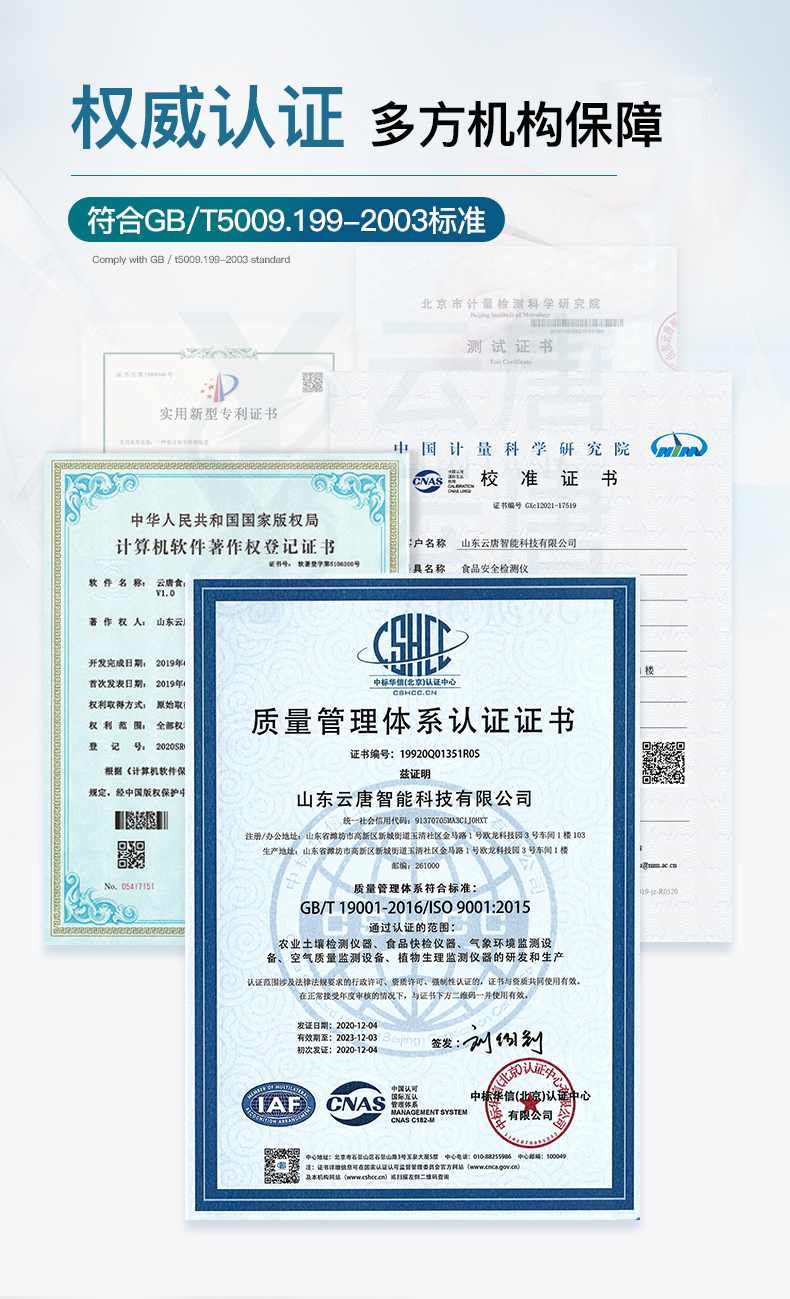 山東云唐智能科技有限公司生產(chǎn)的高智能食品安全檢測儀為集成化食品安全快速檢測分析設(shè)備,采用臺式一體化設(shè)計,可快速檢測200多種食品安全項目,包含非食用化學物質(zhì)、濫用食品添加劑、農(nóng)藥殘留、獸藥殘留、重金屬、病害肉、營養(yǎng)強化劑、抗生素類殘留、激素類殘留、真菌毒素類殘留、化學類殘留等項目的定性定量檢測。目前廣泛應(yīng)用于市場監(jiān)管局、檢測中心、衛(wèi)生監(jiān)督部門、農(nóng)業(yè)部門、院校及各單位食堂、食品肉產(chǎn)品深加工企業(yè)、商超市場、司法部門、餐飲機構(gòu)、養(yǎng)殖場、屠宰場、檢驗檢疫部門等單位。