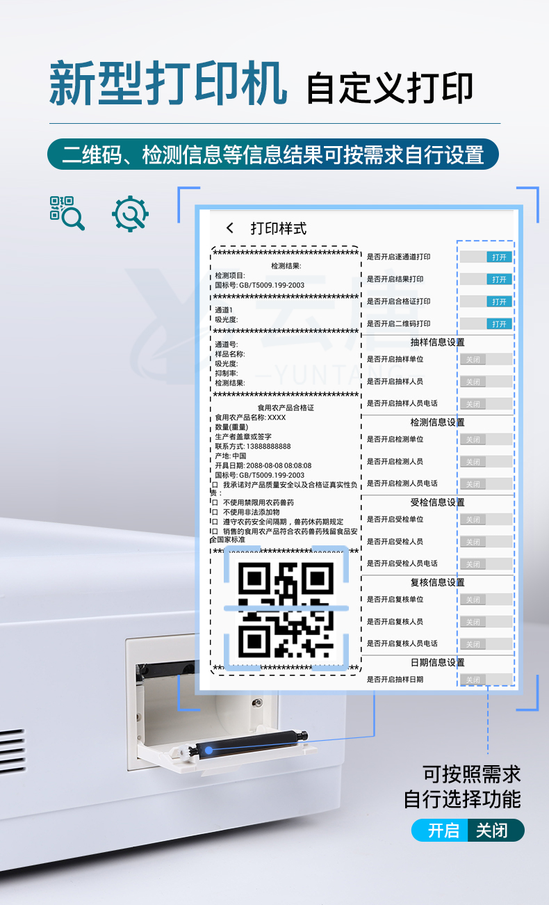 食品快檢儀器內(nèi)置熱敏打印機;系統(tǒng)打印格式多樣化,產(chǎn)品合格證(國家農(nóng)業(yè)部標準要求),二維碼,抽樣信息、檢測信息,受檢信息、復(fù)核信息、抽樣日期、檢測日期等信息結(jié)果,可按實際需求自行設(shè)置開啟或關(guān)閉,完成打印。(需提供對應(yīng)證明)2025-11-07