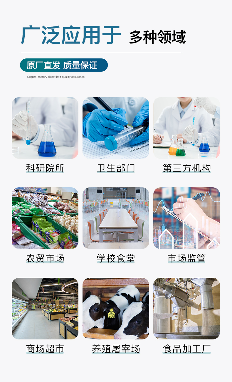 果蔬中:農(nóng)藥殘留(有機磷及氨基甲酸酯類)膠體金類:克百威、毒死蜱、異丙威、啶蟲脒、氟蟲腈、水胺硫磷、甲萘威、三唑磷、百草枯、甲霜靈、殺螟硫磷、百菌清-多菌靈2合1、氟蟲腈-甲萘威2合1、甲基對硫磷、乙草胺、吡蟲啉、多菌靈、阿維菌素、有機磷、甲草胺、涕滅威、百菌清、噻菌靈、三唑酮、氯吡脲、多效唑、氯噻啉、霜霉威、噻蟲啉、辛硫磷、4-氯苯氧乙酸、2,4-二氯苯氧乙酸、2,4,5-三氯苯氧乙酸、6-芐基腺嘌呤、除草定、烯啶蟲胺、噻蟲嗪、異菌脲、氟苯脲、腐霉利、甲氰菊酯、**氯氟氰菊酯、二甲戊靈、氟節(jié)甲基異柳磷、噠螨靈、噻蟲胺、烯酰嗎啉、嘧菌酯、氟樂靈、嘧霉胺、三唑酮/三唑醇、滅蠅胺、戊唑醇、甲拌磷、氯蟲苯甲酰胺、二嗪磷、氧樂果、甲基吡啶磷、阿滅丁、雙甲脒等