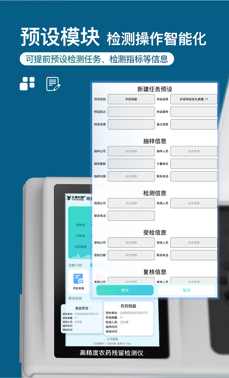 1、儀器采用臺式一體化系統(tǒng)檢測技術(shù),將分光光度模塊、膠體金檢測模塊、新型農(nóng)殘檢測模塊、數(shù)字化管理模塊、無線通訊模塊高度集成于一體,支持檢測200種食品安全檢測項目,同時預(yù)留升級檢測方法。2、儀器檢測模塊標準化、智能化,檢測項目可隨意自由組合。檢測箱體內(nèi)置多個標準檢測單元,檢測模塊可以調(diào)整配置。3、顯示屏幕:儀器采用10.1英寸豎向液晶觸摸屏顯,搭配運行安卓智能操作系統(tǒng),主控芯片采用ARM Cortex-A7,RK3288/4核處理器,主頻1.88Ghz,操作方便,性能更強。4、檢測通道:≥12通道;采用精密旋轉(zhuǎn)比色池設(shè)計,使用同芯片同光源校準精度,解決不同光源之間的誤差值,更加準確**。(1-12通道間誤差0.1%,***:**202022821055.2)5、儀器光源:高精度進口四波長冷光源,每個通道均配置 410、520、590、630nm 波長光源,標配**的光路切換裝置,專利光路切換功能可實現(xiàn)64波長,并且所有檢測項目可實現(xiàn)所有通道同時檢測。6、設(shè)備可一鍵校準,自動保存校準數(shù)據(jù),自動對比校驗,得到精準光源,采用Android SP存儲數(shù)據(jù),光源數(shù)據(jù)永不丟失,方便每一次使用。7、通訊接口:配備無線通信模塊、4G(APN)通訊模塊、藍牙傳輸,同時具有雙USB接口以及RJ45網(wǎng)線接口,可以多方式實現(xiàn)數(shù)據(jù)保存及數(shù)據(jù)傳輸。8、存儲方式:支持U盤存儲,標準USB接口,免驅(qū)動安裝。檢測結(jié)果存儲容量20萬條以上,可生成Excel表格進行拷貝,并具有登錄保護功能。9、智能化操作系統(tǒng):9.1、操作系統(tǒng):儀器可在同一檢測界面自動對應(yīng)相關(guān)檢測通道,一次性選擇1-12個樣品名稱,無需退出界面,節(jié)省操作時間。并可以對每個通道屬性和樣品信息單獨進行編輯,例如送檢單位、人員,檢測人員等,打印時勾選打印顯示。9.2、數(shù)據(jù)集成系統(tǒng):設(shè)備首頁自動匯總分析檢測數(shù)據(jù),包含:周檢測數(shù)據(jù)、月檢測數(shù)據(jù),全部檢測總數(shù)量,均包含檢測總數(shù),合格數(shù),不合格數(shù),以及相關(guān)柱形分析圖,各項檢測數(shù)據(jù)一目了然,無需電腦查詢,更加快捷直觀。9.3、數(shù)據(jù)庫系統(tǒng):十幾項數(shù)據(jù)庫分類管理儀器:包含項目類型、項目數(shù)據(jù)、檢測數(shù)據(jù)、歷史記錄、國標信息、曲線信息、采樣信息、檢測信息、受檢信息、復(fù)核信息、圖表信息、光源校準信息、打印樣式信息、樣品庫信息等等,數(shù)據(jù)庫之間互相協(xié)調(diào)聯(lián)動保證數(shù)據(jù)的真實完整性。同時產(chǎn)品數(shù)據(jù)庫以及歷史檢測記錄支持一鍵檢索功能。9.4、限量規(guī)判系統(tǒng):具有限量查詢、添加物質(zhì)合規(guī)判定系統(tǒng)。檢測出結(jié)果后,系統(tǒng)自動調(diào)用系統(tǒng)數(shù)據(jù)庫中相關(guān)國標進行比對判定,客觀顯示判定結(jié)果是否合格。9.5、項目預(yù)設(shè)系統(tǒng):儀器具有任務(wù)預(yù)設(shè)模塊,一鍵提前預(yù)設(shè),給出方便快捷的新檢測方案,每一個任務(wù)分別可以設(shè)置不同的樣品、批次、編號、來源、備注、抽樣信息、檢測信息、受檢信息、復(fù)核信息等更多信息。樣品送檢時一鍵調(diào)取保存信息,并可多次調(diào)取,大大提高檢測效率。9.6、數(shù)據(jù)監(jiān)管系統(tǒng):同步對接監(jiān)管平臺,數(shù)據(jù)可局域網(wǎng)和互聯(lián)網(wǎng)數(shù)據(jù)上傳,檢測結(jié)果可選擇直接傳至食品安全監(jiān)管平臺。進行區(qū)域食品安全監(jiān)管及大數(shù)據(jù)分析處理與數(shù)據(jù)統(tǒng)計,檢測區(qū)域食品安全長短期動態(tài),達到食品安全問題預(yù)估、預(yù)警。9.7.1、全新打印系統(tǒng):內(nèi)置全新打印機,新創(chuàng)自定義打印方式,可按需靈活勾選控制:產(chǎn)品合格證(國家農(nóng)業(yè)部標準要求),二維碼,抽樣信息、檢測信息,受檢信息、復(fù)核信息、抽樣日期、檢測日期等信息的打印。9.7.2、A4紙版本報告打印功能(選配):設(shè)備擁有兩種結(jié)果展示方式,可以自動生成A4打印模板和小票打印模板兩種樣式,可通過WiFi及網(wǎng)線等方式鏈接外置打印機可進行打印。10、供電模式:儀器交直流兩用,直流12V供電,可連接車載電源,可配6ah大容量充電鋰電池,電量可實時顯示,方便戶外流動測試。11、膠體金檢測模塊:采用單通道CMOS成像處理技術(shù)及膠體金免疫層析技術(shù),可讀取膠體金卡數(shù)據(jù),自動采集、處理分析,將檢測結(jié)果顯示,并可根據(jù)參考限值自動判斷檢測結(jié)果,可檢測常見的獸藥殘留、生物毒素、抗生素、違禁添加物等。11.1、探測技術(shù):CMOS成像探測;11.2、檢測通道:1個通道;11.3、檢測方式:消線法和比色法;11.4、顯示模式:陰性或陽性;11.5、曲線形式:直插式掃描方式,顯示金標卡圖像,實時生成、識別CT曲線圖,無需手動調(diào)整,完成檢測后自動退出檢測卡。兼容市場上其他金標卡,使用耗材不受限制。12、儀器具備遠程升級功能,可定向分客戶分儀器更新,開機后自動更新,并可持續(xù)性免費更新系統(tǒng)版本,無需像傳統(tǒng)產(chǎn)品返廠更新,節(jié)省時間及人力成本并避免了物流運輸返廠升級導(dǎo)致設(shè)備損壞的潛在風險。