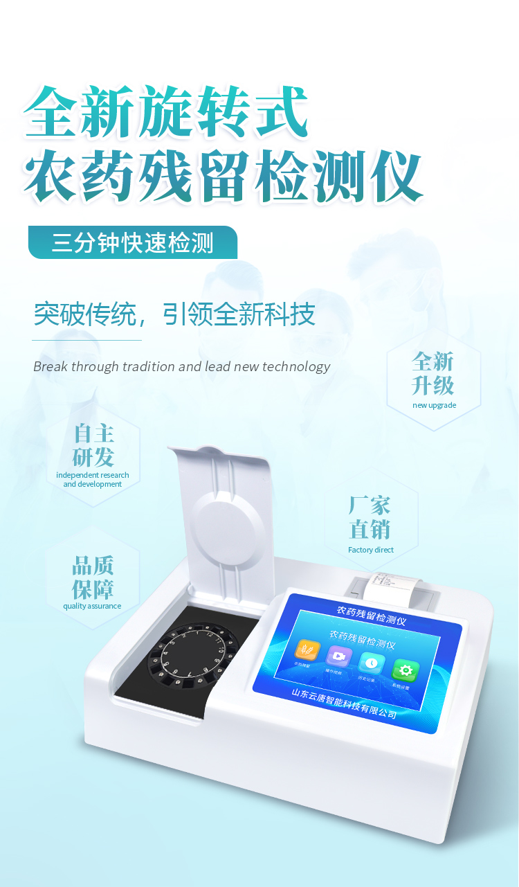 山東云唐智能科技有限公司生產(chǎn)的農(nóng)藥殘留檢測儀廣泛應(yīng)用于主要用于蔬菜、水果、茶葉、糧食、農(nóng)副產(chǎn)品等食品中農(nóng)藥殘留的快速檢測,依據(jù)國標(biāo)GB/T5009.199-2003進行檢測,適用于果蔬茶生產(chǎn)基地以及農(nóng)貿(mào)批發(fā)銷售市場現(xiàn)場檢測,餐館、學(xué)校、食堂、家庭果蔬加工前的安全速測等。