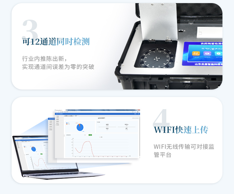 | 安卓智能操作系統(tǒng),采用更加**和人性化操作,儀器具有無線聯(lián)網(wǎng)上傳功能,快速上傳數(shù)據(jù),進(jìn)行數(shù)據(jù)統(tǒng)計和分析。 | 智能化程度高,儀器具有自檢功能:具有開機自檢和調(diào)零功能,具有自動檢測重復(fù)性功能;同時,檢測完成可自動打印檢測報告和二維碼。手機掃碼可顯示出詳細(xì)檢測信息。 | 儀器帶有監(jiān)管平臺,數(shù)據(jù)可局域網(wǎng)和互聯(lián)網(wǎng)數(shù)據(jù)上傳,檢測結(jié)果直接傳至食品安全監(jiān)管平臺。進(jìn)行區(qū)域食品安全監(jiān)管及大數(shù)據(jù)分析處理與數(shù)據(jù)統(tǒng)計,檢測區(qū)域食品安全長短期動態(tài),達(dá)到食品安全問題預(yù)估、預(yù)警 。 | 樣品處理簡單省力,整體操作快速、安全、便捷。 | 儀器具有自身保護(hù)功能,可設(shè)置用戶名及密碼,防止非工作人員操作等。 | 內(nèi)置強大的數(shù)據(jù)庫,可在儀器上直接選擇樣品名稱、檢測指標(biāo)、送檢單位等信息,也可在儀器上直接編輯錄入樣品名稱、檢測指標(biāo)、送檢單位等信息并保存進(jìn)樣品數(shù)據(jù)庫,方便后期操作調(diào)取使用。 | 儀器具有重新校準(zhǔn)、鎖定、恢復(fù)出廠設(shè)置功能。 |