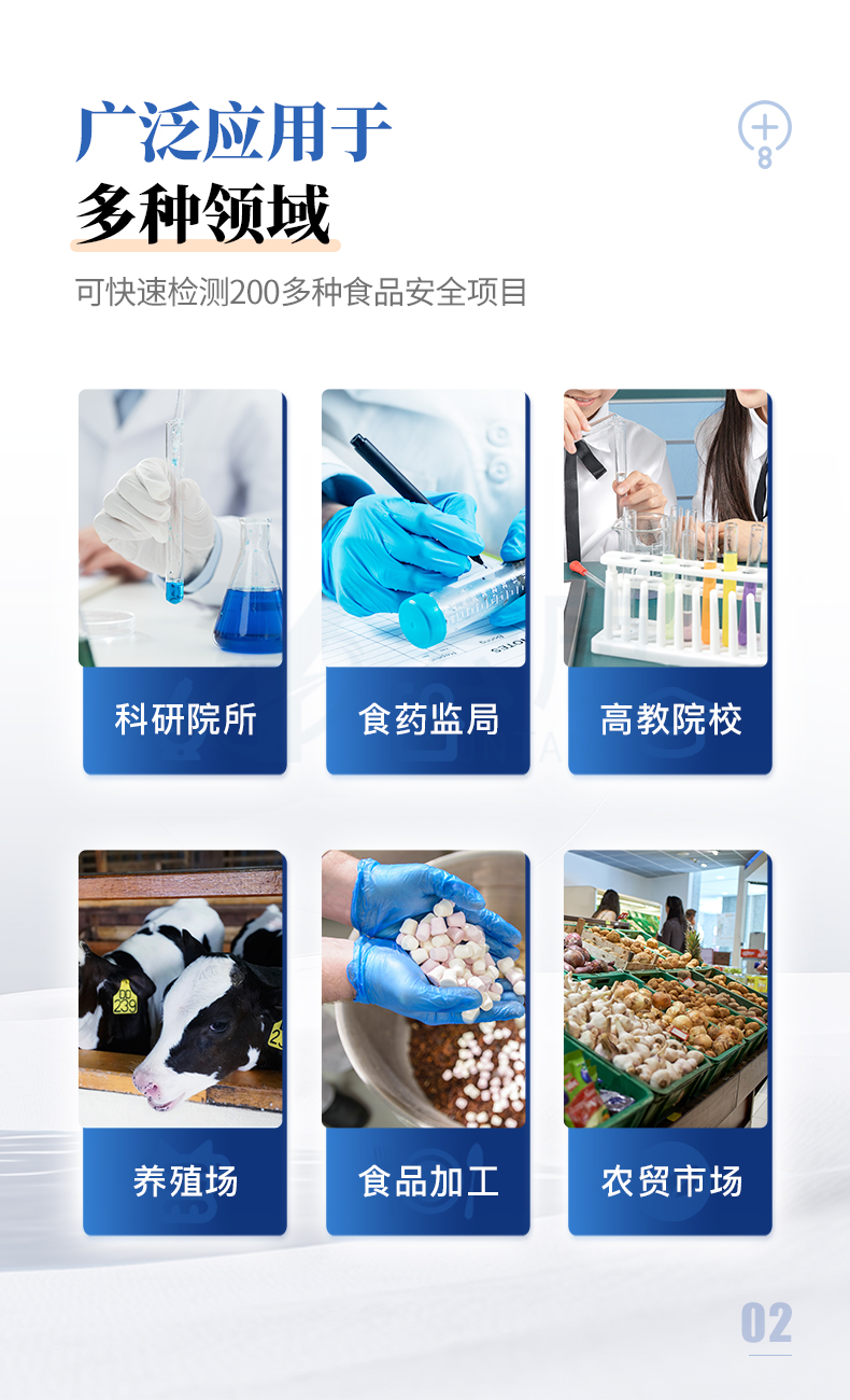 | 食品添加劑:二氧化硫、雙氧水、亞硝酸鹽、硝酸鹽、苯甲酸鈉、山梨酸鉀、糖精鈉、甜蜜素、木耳硫酸鎂等 | 有毒有害物質(zhì):甲醛、吊白塊、硼砂、過(guò)氧化苯甲酰、溴酸鉀、羅丹明B、三聚氰胺、蘇丹紅、工業(yè)堿、尿素、明礬等 | 果蔬:農(nóng)藥殘留(酶抑制率法) | 病害肉診斷:組胺、揮發(fā)性鹽基氮; | 重金屬含量:鉛、鎘、鉻、汞、砷、錫、鎳、鋁等; | 食用油脂: 過(guò)氧化值、酸價(jià)等 | 瘦肉精激素類(獸藥):鹽酸克倫特羅、沙丁胺醇、萊克多巴胺、己烯雌酚等 | 抗生素殘留類(獸藥):四環(huán)素類、硝基呋喃類、磺胺類、β-興奮劑類、沙星類、磺胺類、喹諾酮類,甲砜霉素,氟苯尼考,金剛烷胺、替米考星、慶大霉素、林可霉素、鏈霉素、恩諾沙星、環(huán)丙沙星、頭孢啦啶、青霉素、阿莫西林等 | 真菌毒素類:食用油、糧食及飼料中黃曲霉毒素B1、黃曲霉毒素總量,奶中黃曲霉毒素M1、嘔吐毒素、玉米赤霉烯酮、赭曲霉毒素A、T2毒素、伏馬毒素等; | 水酒飲品分析:酒中甲醇、乙醇、乳品及牛奶中蛋白質(zhì), | 調(diào)味品成分:食醋的總酸、醬油的總酸、芝麻油純度、谷氨酸鈉、醬油氨基酸態(tài)氮、食鹽中亞鐵氰化鉀、食鹽中碘等 | 食用色素類:紅色色素(胭脂紅、莧菜紅、赤蘚紅、誘惑紅)、黃色色素(檸檬黃、日落黃)、藍(lán)色色素(亮藍(lán))等 | 動(dòng)物疫病類:禽流感、新城疫、牛羊口蹄疫、牛羊結(jié)核病、牛羊包蟲、牛羊布病、小反芻獸、豬藍(lán)耳病毒、豬瘟病毒、豬偽狂犬病毒、豬細(xì)小、豬圓環(huán)、犬細(xì)小病毒、犬瘟熱病毒、犬狂犬病毒等; | 蜂蜜成分:果糖和葡萄糖、蔗糖、淀粉酶、酸度等 | 水產(chǎn)品安全類:孔雀石綠、氯霉素、呋喃妥因、呋喃西林、呋喃它酮、呋喃唑酮等 | 蛋類藥物殘留:氯霉素,四環(huán)素,磺胺類,喹諾酮類,呋喃西林,呋喃它酮,呋喃妥因,呋喃唑酮,氟苯尼考,阿莫西林、頭孢氨芐、紅霉素、鏈霉素等 |