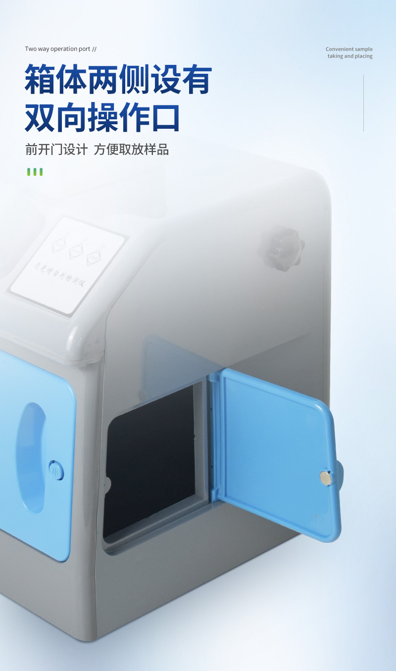 | ★依據(jù)行標(biāo):NY/T1257-2006 | ★儀器箱體兩側(cè)設(shè)有雙向操作口,前開門設(shè)計(jì),方便取放樣品。 | ★用戶可通過箱體直接觀察到暗室內(nèi)的樣品。 | ★特別設(shè)計(jì)防紫外線觀察口,使操作人員避免紫外線損傷。 | ★紫外短波波長:254nm | ★紫外長波波長:365nm | ★可見光源 | ★紫外濾色片尺寸:200×50mm | ★工作電源: 220V交流電源 | ★使用溫度: 0℃-40℃ | ★使用濕度:<90% (40℃) | ★儀器功耗: 20W | ★外型尺寸:300×200×290mm |