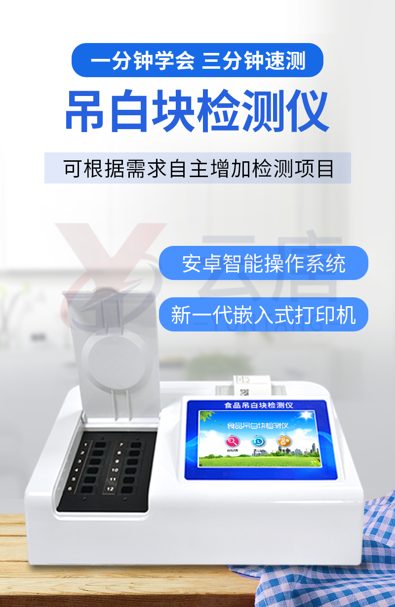 儀器采用臺(tái)式一體化系統(tǒng)檢測(cè)技術(shù),將分光光度模塊、新型農(nóng)殘檢測(cè)模塊、數(shù)字化管理模塊、無(wú)線通訊模塊高度集成于一體,支持檢測(cè)200種食品安全檢測(cè)項(xiàng)目,同時(shí)預(yù)留升級(jí)檢測(cè)方法。儀器檢測(cè)模塊標(biāo)準(zhǔn)化、智能化,可隨意自由組合。檢測(cè)箱體內(nèi)置多個(gè)標(biāo)準(zhǔn)檢測(cè)單元,檢測(cè)模塊可以調(diào)整配置。儀器采用全新安卓智能系統(tǒng),主控芯片采用 ARM Cortex-A7,RK3288/4核處理器,10.1寸高清液晶觸摸豎屏,更加**的UI交互界面,運(yùn)轉(zhuǎn)快捷;儀器配備無(wú)線通信模塊: 4G(APN)通訊模塊、Wifi模塊,藍(lán)牙傳輸,同時(shí)具有雙USB接口以及RJ45接口能以多種方式實(shí)現(xiàn)數(shù)據(jù)保存和數(shù)據(jù)傳輸功能。創(chuàng)新檢測(cè)模式:★檢測(cè)通道:≥12通道;采用精密旋轉(zhuǎn)比色池設(shè)計(jì),使用同芯片同光源校準(zhǔn)精度,解決不同光源之間的誤差值。1-12通道間誤差0.1%。(***:**202022821055.2)★儀器具有自動(dòng)識(shí)別比色皿檢測(cè)功能,即:將樣品比色皿放入儀器后,點(diǎn)擊樣品檢測(cè),儀器自動(dòng)識(shí)別比色皿進(jìn)行通道檢測(cè)。進(jìn)口高精光源:高精度進(jìn)口四波長(zhǎng)冷光源,通道配置 410、520、590、630nm 波長(zhǎng)光源,一個(gè)光源芯片驅(qū)動(dòng)一個(gè)光源,誤差極小,每臺(tái)設(shè)備單獨(dú)**校準(zhǔn)光源,**比對(duì),同時(shí)參照四種不同波段光源全方位覆蓋市面上99%的農(nóng)殘食品項(xiàng)目檢測(cè)。智能化操作系統(tǒng):便捷操作系統(tǒng):設(shè)備檢測(cè)時(shí)可在同一檢測(cè)界面自動(dòng)對(duì)應(yīng)相關(guān)檢測(cè)通道一次性選擇1-12個(gè)樣品名稱,無(wú)須退出界面,節(jié)省操作時(shí)間。數(shù)據(jù)集成系統(tǒng):設(shè)備首頁(yè)自動(dòng)統(tǒng)計(jì)檢測(cè)數(shù)據(jù)包含:周檢測(cè)數(shù)據(jù)、月檢測(cè)數(shù)據(jù),全部檢測(cè)總數(shù)量,均包含檢測(cè)總數(shù),合格數(shù),不合格數(shù),以及相關(guān)柱形分析圖,對(duì)各項(xiàng)檢測(cè)數(shù)據(jù)清晰掌握,無(wú)需電腦查詢,更加快捷直觀。項(xiàng)目預(yù)設(shè)系統(tǒng):支持添加單個(gè)及多個(gè)相同或不相同的任務(wù)預(yù)設(shè),一鍵快速調(diào)取,每一個(gè)任務(wù)分別可以設(shè)置不同的樣品、批次、編號(hào)、來(lái)源、備注、抽樣信息、檢測(cè)信息、受檢信息、復(fù)核信息等更多信息。無(wú)縫鏈接平臺(tái)和APP實(shí)時(shí)查看下發(fā)任務(wù)。數(shù)據(jù)監(jiān)管系統(tǒng):同步對(duì)接監(jiān)管平臺(tái),數(shù)據(jù)可局域網(wǎng)和互聯(lián)網(wǎng)數(shù)據(jù)上傳,檢測(cè)結(jié)果可選擇直接傳至食品安全監(jiān)管平臺(tái)。集成OSS輸出存儲(chǔ)服務(wù)、區(qū)分設(shè)備定向管理應(yīng)用,進(jìn)行區(qū)域食品安全監(jiān)管及大數(shù)據(jù)分析處理與數(shù)據(jù)統(tǒng)計(jì),檢測(cè)區(qū)域食品安全長(zhǎng)短期動(dòng)態(tài),達(dá)到食品安全問(wèn)題預(yù)估、預(yù)警。自定義打印系統(tǒng):內(nèi)置全新打印系統(tǒng),新創(chuàng)自定義打印方式,可按需靈活設(shè)置開啟或關(guān)閉:產(chǎn)品合格證(國(guó)家農(nóng)業(yè)部標(biāo)準(zhǔn)要求),二維碼,抽樣信息、檢測(cè)信息,受檢信息、復(fù)核信息、抽樣日期、檢測(cè)日期等信息的打印。系統(tǒng)遠(yuǎn)程更新功能:可定向分客戶分儀器更新系統(tǒng),按照不同客戶后期實(shí)際需求添加項(xiàng)目,無(wú)需機(jī)器返廠,即可遠(yuǎn)程實(shí)時(shí)升級(jí)全新系統(tǒng),節(jié)省時(shí)間成本及避免運(yùn)輸造成設(shè)備損壞。儀器主機(jī)采用一體化防水、抗壓、防撞擊、防腐蝕箱體設(shè)計(jì),同時(shí)配備交直流供電,可連接車載電源,可選配大容量充電鋰電池,滿足現(xiàn)場(chǎng)野外檢測(cè)需求。安全證書,放心保障:儀器具有中國(guó)計(jì)量科學(xué)研究院校準(zhǔn)證書,權(quán)威認(rèn)證。