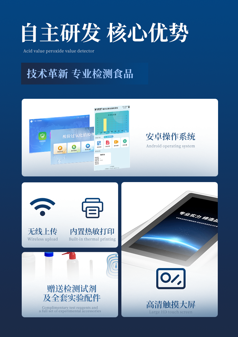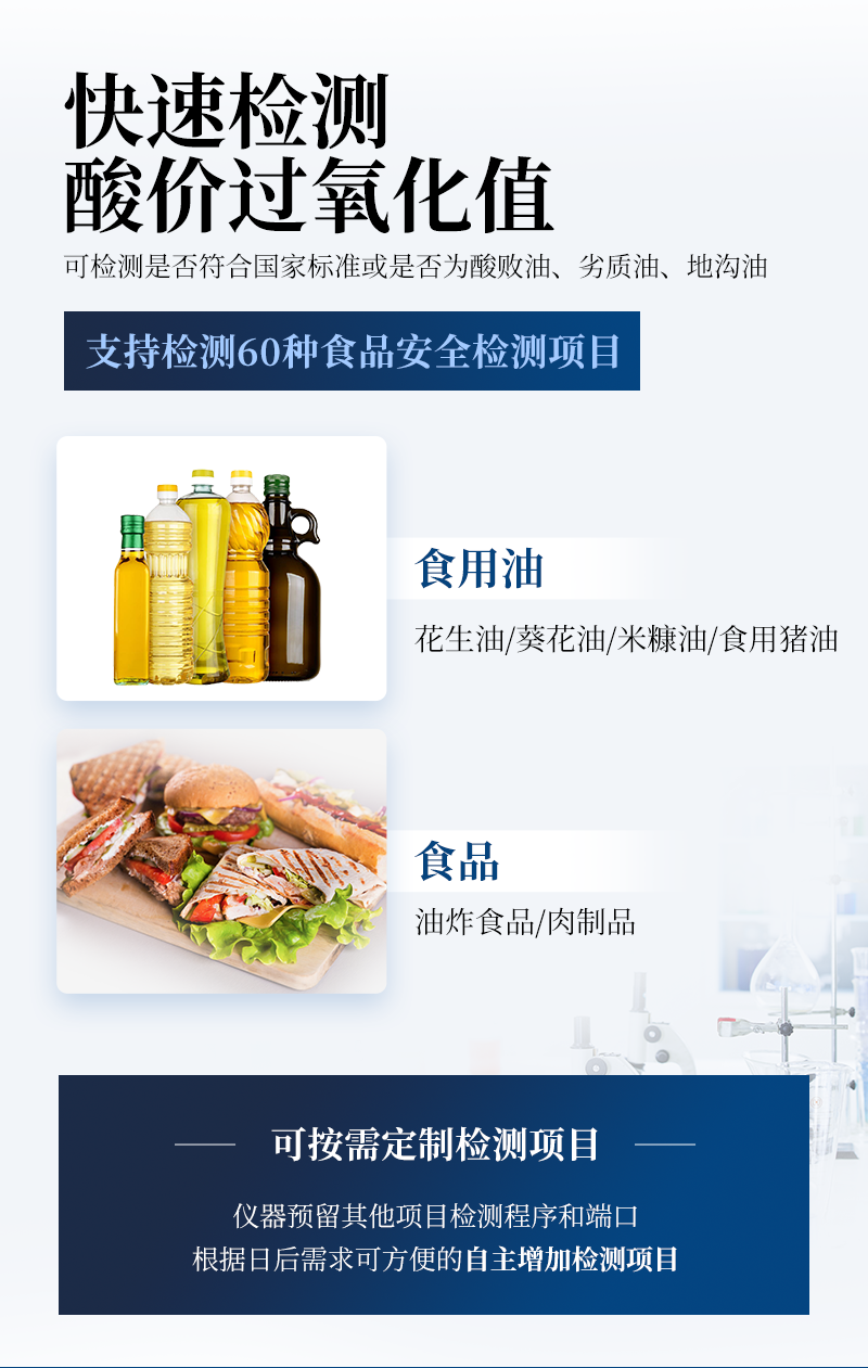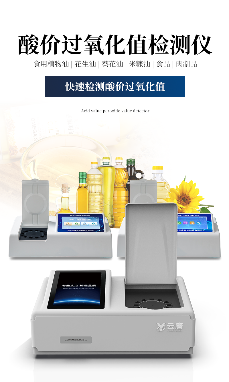 山東云唐智能科技有限公司生產(chǎn)的酸價過氧化值檢測儀為集成化食品安全快速檢測分析設備,采用臺式一體化設計,能夠快速檢測食用植物油、食用豬油、花生油、葵花油、米糠油、食品、肉制品中的過氧化值及酸價含量;儀器預留其他項目檢測程序和端口,根據(jù)日后需求可進行遠程升級。