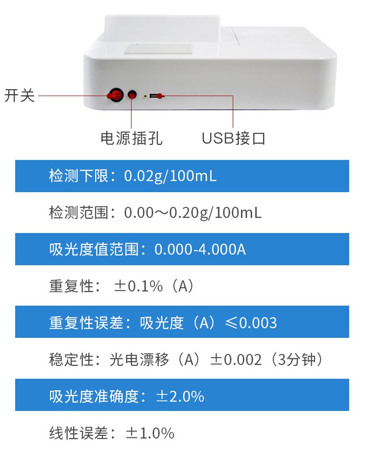 | 儀器采用臺(tái)式一體化系統(tǒng)檢測(cè)技術(shù),將分光光度模塊、新型農(nóng)殘檢測(cè)模塊、數(shù)字化管理模塊、無(wú)線(xiàn)通訊模塊高度集成于一體,支持檢測(cè)200種食品安全檢測(cè)項(xiàng)目,同時(shí)預(yù)留升級(jí)檢測(cè)方法。 | 儀器檢測(cè)模塊標(biāo)準(zhǔn)化、智能化,可隨意自由組合。檢測(cè)箱體內(nèi)置多個(gè)標(biāo)準(zhǔn)檢測(cè)單元,檢測(cè)模塊可以調(diào)整配置。 | 儀器采用全新安卓智能系統(tǒng),主控芯片采用 ARM Cortex-A7,RK3288/4核處理器,10.1寸高清液晶觸摸豎屏,更加**的UI交互界面,運(yùn)轉(zhuǎn)快捷;儀器配備無(wú)線(xiàn)通信模塊: 4G(APN)通訊模塊、Wifi模塊,藍(lán)牙傳輸,同時(shí)具有雙USB接口以及RJ45接口能以多種方式實(shí)現(xiàn)數(shù)據(jù)保存和數(shù)據(jù)傳輸功能。 | 創(chuàng)新檢測(cè)模式: | ★檢測(cè)通道:≥12通道;采用精密旋轉(zhuǎn)比色池設(shè)計(jì),使用同芯片同光源校準(zhǔn)精度,解決不同光源之間的誤差值。1-12通道間誤差0.1%。(***:**202022821055.2) | ★儀器具有自動(dòng)識(shí)別比色皿檢測(cè)功能,即:將樣品比色皿放入儀器后,點(diǎn)擊樣品檢測(cè),儀器自動(dòng)識(shí)別比色皿進(jìn)行通道檢測(cè)。 | 進(jìn)口高精光源: | 高精度進(jìn)口四波長(zhǎng)冷光源,通道配置 410、520、590、630nm 波長(zhǎng)光源,一個(gè)光源芯片驅(qū)動(dòng)一個(gè)光源,誤差極小,每臺(tái)設(shè)備單獨(dú)**校準(zhǔn)光源,**比對(duì),同時(shí)參照四種不同波段光源全方位覆蓋市面上99%的農(nóng)殘食品項(xiàng)目檢測(cè)。 | 智能化操作系統(tǒng): | 便捷操作系統(tǒng):設(shè)備檢測(cè)時(shí)可在同一檢測(cè)界面自動(dòng)對(duì)應(yīng)相關(guān)檢測(cè)通道一次性選擇1-12個(gè)樣品名稱(chēng),無(wú)須退出界面,節(jié)省操作時(shí)間。 | 數(shù)據(jù)集成系統(tǒng):設(shè)備首頁(yè)自動(dòng)統(tǒng)計(jì)檢測(cè)數(shù)據(jù)包含:周檢測(cè)數(shù)據(jù)、月檢測(cè)數(shù)據(jù),全部檢測(cè)總數(shù)量,均包含檢測(cè)總數(shù),合格數(shù),不合格數(shù),以及相關(guān)柱形分析圖,對(duì)各項(xiàng)檢測(cè)數(shù)據(jù)清晰掌握,無(wú)需電腦查詢(xún),更加快捷直觀。 | 項(xiàng)目預(yù)設(shè)系統(tǒng):支持添加單個(gè)及多個(gè)相同或不相同的任務(wù)預(yù)設(shè),一鍵快速調(diào)取,每一個(gè)任務(wù)分別可以設(shè)置不同的樣品、批次、編號(hào)、來(lái)源、備注、抽樣信息、檢測(cè)信息、受檢信息、復(fù)核信息等更多信息。無(wú)縫鏈接平臺(tái)和APP實(shí)時(shí)查看下發(fā)任務(wù)。 | 數(shù)據(jù)監(jiān)管系統(tǒng):同步對(duì)接監(jiān)管平臺(tái),數(shù)據(jù)可局域網(wǎng)和互聯(lián)網(wǎng)數(shù)據(jù)上傳,檢測(cè)結(jié)果可選擇直接傳至食品安全監(jiān)管平臺(tái)。集成OSS輸出存儲(chǔ)服務(wù)、區(qū)分設(shè)備定向管理應(yīng)用,進(jìn)行區(qū)域食品安全監(jiān)管及大數(shù)據(jù)分析處理與數(shù)據(jù)統(tǒng)計(jì),檢測(cè)區(qū)域食品安全長(zhǎng)短期動(dòng)態(tài),達(dá)到食品安全問(wèn)題預(yù)估、預(yù)警。 | 自定義打印系統(tǒng):內(nèi)置全新打印系統(tǒng),新創(chuàng)自定義打印方式,可按需靈活設(shè)置開(kāi)啟或關(guān)閉:產(chǎn)品合格證(國(guó)家農(nóng)業(yè)部標(biāo)準(zhǔn)要求),二維碼,抽樣信息、檢測(cè)信息,受檢信息、復(fù)核信息、抽樣日期、檢測(cè)日期等信息的打印。 | 系統(tǒng)遠(yuǎn)程更新功能:可定向分客戶(hù)分儀器更新系統(tǒng),按照不同客戶(hù)后期實(shí)際需求添加項(xiàng)目,無(wú)需機(jī)器返廠,即可遠(yuǎn)程實(shí)時(shí)升級(jí)全新系統(tǒng),節(jié)省時(shí)間成本及避免運(yùn)輸造成設(shè)備損壞。 | 儀器主機(jī)采用一體化防水、抗壓、防撞擊、防腐蝕箱體設(shè)計(jì),同時(shí)配備交直流供電,可連接車(chē)載電源,可選配大容量充電鋰電池,滿(mǎn)足現(xiàn)場(chǎng)野外檢測(cè)需求。 | 安全證書(shū),放心保障:儀器具有中國(guó)計(jì)量科學(xué)研究院校準(zhǔn)證書(shū),權(quán)威認(rèn)證。 |