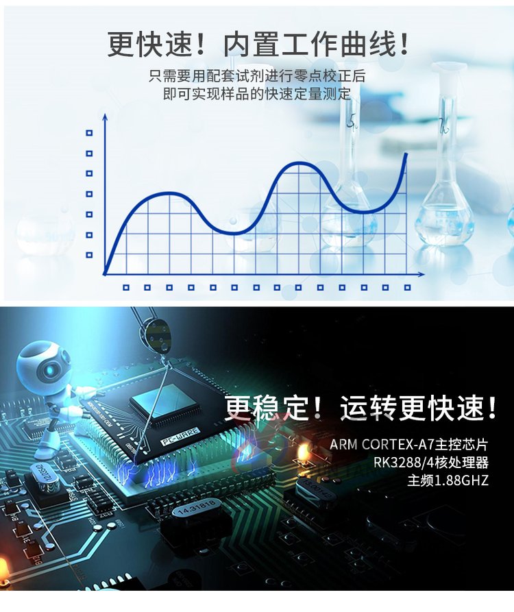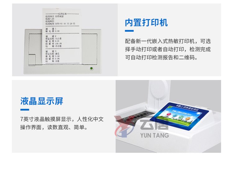 儀器采用臺式一體化系統(tǒng)檢測技術,將分光光度模塊、新型農(nóng)殘檢測模塊、數(shù)字化管理模塊、無線通訊模塊高度集成于一體,支持檢測200種食品安全檢測項目,同時預留升級檢測方法。儀器檢測模塊標準化、智能化,可隨意自由組合。檢測箱體內(nèi)置多個標準檢測單元,檢測模塊可以調(diào)整配置。儀器采用全新安卓智能系統(tǒng),主控芯片采用 ARM Cortex-A7,RK3288/4核處理器,10.1寸高清液晶觸摸豎屏,更加**的UI交互界面,運轉(zhuǎn)快捷;儀器配備無線通信模塊: 4G(APN)通訊模塊、Wifi模塊,藍牙傳輸,同時具有雙USB接口以及RJ45接口能以多種方式實現(xiàn)數(shù)據(jù)保存和數(shù)據(jù)傳輸功能。創(chuàng)新檢測模式:★檢測通道:≥12通道;采用精密旋轉(zhuǎn)比色池設計,使用同芯片同光源校準精度,解決不同光源之間的誤差值。1-12通道間誤差0.1%。(***:**202022821055.2)★儀器具有自動識別比色皿檢測功能,即:將樣品比色皿放入儀器后,點擊樣品檢測,儀器自動識別比色皿進行通道檢測。進口高精光源:高精度進口四波長冷光源,通道配置 410、520、590、630nm 波長光源,一個光源芯片驅(qū)動一個光源,誤差極小,每臺設備單獨**校準光源,**比對,同時參照四種不同波段光源全方位覆蓋市面上99%的農(nóng)殘食品項目檢測。智能化操作系統(tǒng):便捷操作系統(tǒng):設備檢測時可在同一檢測界面自動對應相關檢測通道一次性選擇1-12個樣品名稱,無須退出界面,節(jié)省操作時間。數(shù)據(jù)集成系統(tǒng):設備首頁自動統(tǒng)計檢測數(shù)據(jù)包含:周檢測數(shù)據(jù)、月檢測數(shù)據(jù),全部檢測總數(shù)量,均包含檢測總數(shù),合格數(shù),不合格數(shù),以及相關柱形分析圖,對各項檢測數(shù)據(jù)清晰掌握,無需電腦查詢,更加快捷直觀。項目預設系統(tǒng):支持添加單個及多個相同或不相同的任務預設,一鍵快速調(diào)取,每一個任務分別可以設置不同的樣品、批次、編號、來源、備注、抽樣信息、檢測信息、受檢信息、復核信息等更多信息。無縫鏈接平臺和APP實時查看下發(fā)任務。數(shù)據(jù)監(jiān)管系統(tǒng):同步對接監(jiān)管平臺,數(shù)據(jù)可局域網(wǎng)和互聯(lián)網(wǎng)數(shù)據(jù)上傳,檢測結(jié)果可選擇直接傳至食品安全監(jiān)管平臺。集成OSS輸出存儲服務、區(qū)分設備定向管理應用,進行區(qū)域食品安全監(jiān)管及大數(shù)據(jù)分析處理與數(shù)據(jù)統(tǒng)計,檢測區(qū)域食品安全長短期動態(tài),達到食品安全問題預估、預警。自定義打印系統(tǒng):內(nèi)置全新打印系統(tǒng),新創(chuàng)自定義打印方式,可按需靈活設置開啟或關閉:產(chǎn)品合格證(國家農(nóng)業(yè)部標準要求),二維碼,抽樣信息、檢測信息,受檢信息、復核信息、抽樣日期、檢測日期等信息的打印。系統(tǒng)遠程更新功能:可定向分客戶分儀器更新系統(tǒng),按照不同客戶后期實際需求添加項目,無需機器返廠,即可遠程實時升級全新系統(tǒng),節(jié)省時間成本及避免運輸造成設備損壞。儀器主機采用一體化防水、抗壓、防撞擊、防腐蝕箱體設計,同時配備交直流供電,可連接車載電源,可選配大容量充電鋰電池,滿足現(xiàn)場野外檢測需求。安全證書,放心保障:儀器具有中國計量科學研究院校準證書,權威認證。