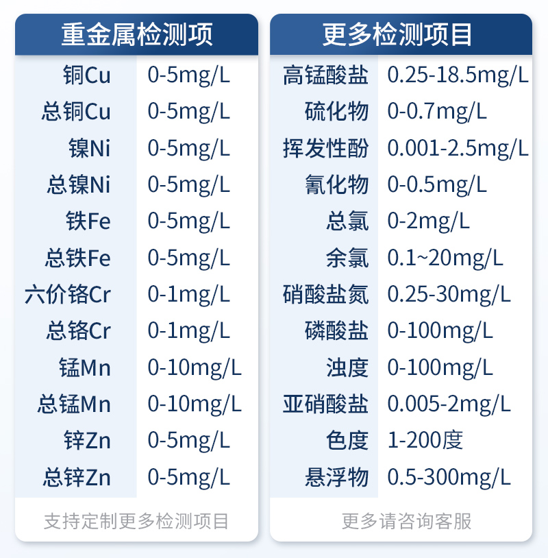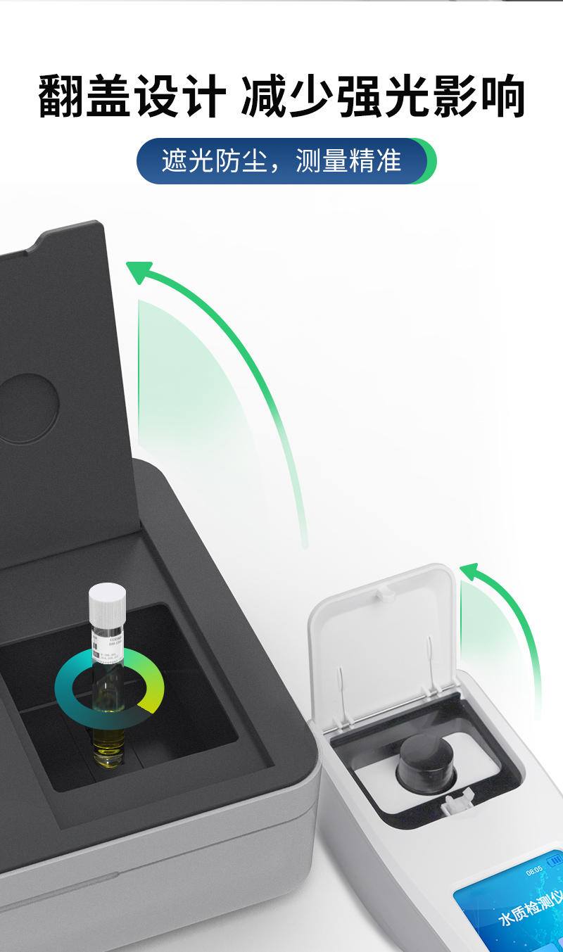 提取一定量水體樣品,經過前處理后根據不同檢測項目按照試劑說明書滴入檢測試劑,檢測試劑會與水體中的待測物質發(fā)生反應,反應液呈現特定的顏色。