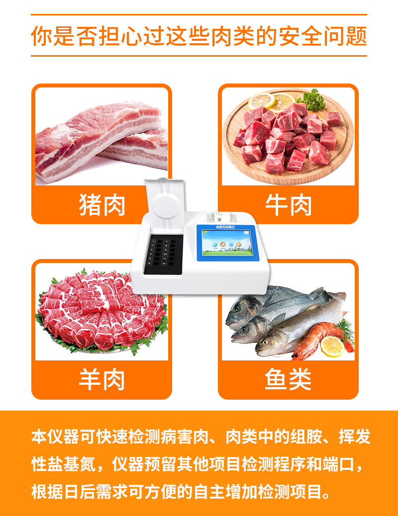 可快速檢測病害肉、組胺、揮發(fā)性鹽基氮,儀器預(yù)留其他項目檢測程序和端口,根據(jù)日后需求可方便的自主增加檢測項目。