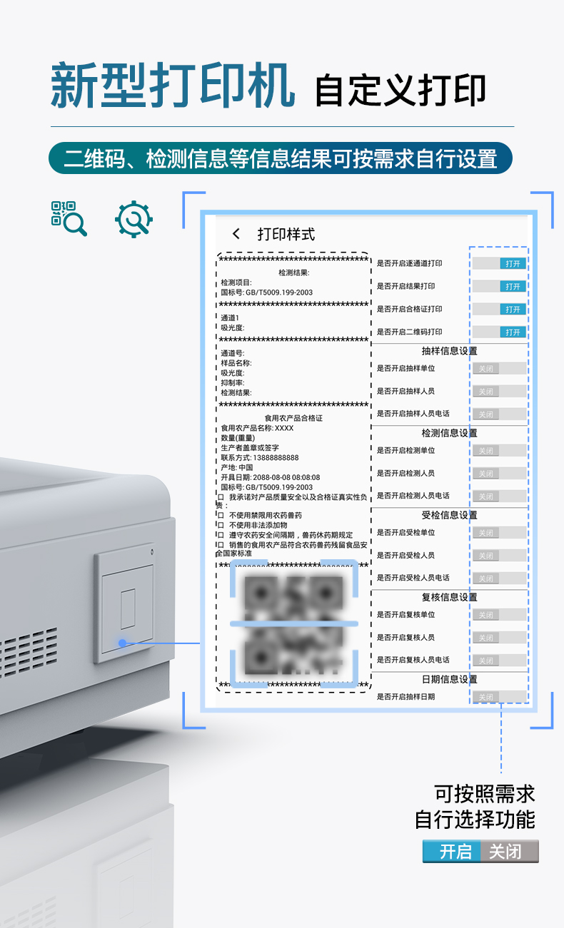 | 1、儀器采用臺式一體化系統(tǒng)檢測技術(shù),將分光光度模塊、膠體金檢測模塊、新型農(nóng)殘檢測模塊、數(shù)字化管理模塊、無線通訊模塊高度集成于一體,支持檢測200種食品安全檢測項(xiàng)目,同時預(yù)留升級檢測方法。 | 2、儀器檢測模塊標(biāo)準(zhǔn)化、智能化,檢測項(xiàng)目可隨意自由組合。檢測箱體內(nèi)置多個標(biāo)準(zhǔn)檢測單元,檢測模塊可以調(diào)整配置。 | 3、顯示屏幕:儀器采用10.1英寸豎向液晶觸摸屏顯,搭配運(yùn)行安卓智能操作系統(tǒng),主控芯片采用ARM Cortex-A7,RK3288/4核處理器,主頻1.88Ghz,操作方便,性能更強(qiáng)。 | 4、檢測通道:≥12通道;采用精密旋轉(zhuǎn)比色池設(shè)計(jì),使用同芯片同光源校準(zhǔn)精度,解決不同光源之間的誤差值,更加準(zhǔn)確**。(1-12通道間誤差0.1%,***:**202022821055.2) | 5、儀器光源:高精度進(jìn)口四波長冷光源,每個通道均配置 410、520、590、630nm 波長光源,標(biāo)配**的光路切換裝置,專利光路切換功能可實(shí)現(xiàn)64波長,并且所有檢測項(xiàng)目可實(shí)現(xiàn)所有通道同時檢測。 | 6、設(shè)備可一鍵校準(zhǔn),自動保存校準(zhǔn)數(shù)據(jù),自動對比校驗(yàn),得到精準(zhǔn)光源,采用Android SP存儲數(shù)據(jù),光源數(shù)據(jù)永不丟失,方便每一次使用。 | 7、通訊接口:配備無線通信模塊、4G(APN)通訊模塊、藍(lán)牙傳輸,同時具有雙USB接口以及RJ45網(wǎng)線接口,可以多方式實(shí)現(xiàn)數(shù)據(jù)保存及數(shù)據(jù)傳輸。 | 8、存儲方式:支持U盤存儲,標(biāo)準(zhǔn)USB接口,免驅(qū)動安裝。檢測結(jié)果存儲容量20萬條以上,可生成Excel表格進(jìn)行拷貝,并具有登錄保護(hù)功能。 | 9、智能化操作系統(tǒng): | 9.1、操作系統(tǒng):儀器可在同一檢測界面自動對應(yīng)相關(guān)檢測通道,一次性選擇1-12個樣品名稱,無需退出界面,節(jié)省操作時間。并可以對每個通道屬性和樣品信息單獨(dú)進(jìn)行編輯,例如送檢單位、人員,檢測人員等,打印時勾選打印顯示。 | 9.2、數(shù)據(jù)集成系統(tǒng):設(shè)備首頁自動匯總分析檢測數(shù)據(jù),包含:周檢測數(shù)據(jù)、月檢測數(shù)據(jù),全部檢測總數(shù)量,均包含檢測總數(shù),合格數(shù),不合格數(shù),以及相關(guān)柱形分析圖,各項(xiàng)檢測數(shù)據(jù)一目了然,無需電腦查詢,更加快捷直觀。 | 9.3、數(shù)據(jù)庫系統(tǒng):十幾項(xiàng)數(shù)據(jù)庫分類管理儀器:包含項(xiàng)目類型、項(xiàng)目數(shù)據(jù)、檢測數(shù)據(jù)、歷史記錄、國標(biāo)信息、曲線信息、采樣信息、檢測信息、受檢信息、復(fù)核信息、圖表信息、光源校準(zhǔn)信息、打印樣式信息、樣品庫信息等等,數(shù)據(jù)庫之間互相協(xié)調(diào)聯(lián)動保證數(shù)據(jù)的真實(shí)完整性。同時產(chǎn)品數(shù)據(jù)庫以及歷史檢測記錄支持一鍵檢索功能。 | 9.4、限量規(guī)判系統(tǒng):具有限量查詢、添加物質(zhì)合規(guī)判定系統(tǒng)。檢測出結(jié)果后,系統(tǒng)自動調(diào)用系統(tǒng)數(shù)據(jù)庫中相關(guān)國標(biāo)進(jìn)行比對判定,客觀顯示判定結(jié)果是否合格。 | 9.5、項(xiàng)目預(yù)設(shè)系統(tǒng):儀器具有任務(wù)預(yù)設(shè)模塊,一鍵提前預(yù)設(shè),給出方便快捷的新檢測方案,每一個任務(wù)分別可以設(shè)置不同的樣品、批次、編號、來源、備注、抽樣信息、檢測信息、受檢信息、復(fù)核信息等更多信息。樣品送檢時一鍵調(diào)取保存信息,并可多次調(diào)取,大大提高檢測效率。 | 9.6、數(shù)據(jù)監(jiān)管系統(tǒng):同步對接監(jiān)管平臺,數(shù)據(jù)可局域網(wǎng)和互聯(lián)網(wǎng)數(shù)據(jù)上傳,檢測結(jié)果可選擇直接傳至食品安全監(jiān)管平臺。進(jìn)行區(qū)域食品安全監(jiān)管及大數(shù)據(jù)分析處理與數(shù)據(jù)統(tǒng)計(jì),檢測區(qū)域食品安全長短期動態(tài),達(dá)到食品安全問題預(yù)估、預(yù)警。 | 9.7.1、全新打印系統(tǒng):內(nèi)置全新打印機(jī),新創(chuàng)自定義打印方式,可按需靈活勾選控制:產(chǎn)品合格證(國家農(nóng)業(yè)部標(biāo)準(zhǔn)要求),二維碼,抽樣信息、檢測信息,受檢信息、復(fù)核信息、抽樣日期、檢測日期等信息的打印。 | 9.7.2、A4紙版本報(bào)告打印功能(選配):設(shè)備擁有兩種結(jié)果展示方式,可以自動生成A4打印模板和小票打印模板兩種樣式,可通過WiFi及網(wǎng)線等方式鏈接外置打印機(jī)可進(jìn)行打印。 | 10、供電模式:儀器交直流兩用,直流12V供電,可連接車載電源,可配6ah大容量充電鋰電池,電量可實(shí)時顯示,方便戶外流動測試。 | 11、膠體金檢測模塊:采用單通道CMOS成像處理技術(shù)及膠體金免疫層析技術(shù),可讀取膠體金卡數(shù)據(jù),自動采集、處理分析,將檢測結(jié)果顯示,并可根據(jù)參考限值自動判斷檢測結(jié)果,可檢測常見的獸藥殘留、生物毒素、抗生素、違禁添加物等。 | 11.1、探測技術(shù):CMOS成像探測; | 11.2、檢測通道:1個通道; | 11.3、檢測方式:消線法和比色法; | 11.4、顯示模式:陰性或陽性; | 11.5、曲線形式:直插式掃描方式,顯示金標(biāo)卡圖像,實(shí)時生成、識別CT曲線圖,無需手動調(diào)整,完成檢測后自動退出檢測卡。兼容市場上其他金標(biāo)卡,使