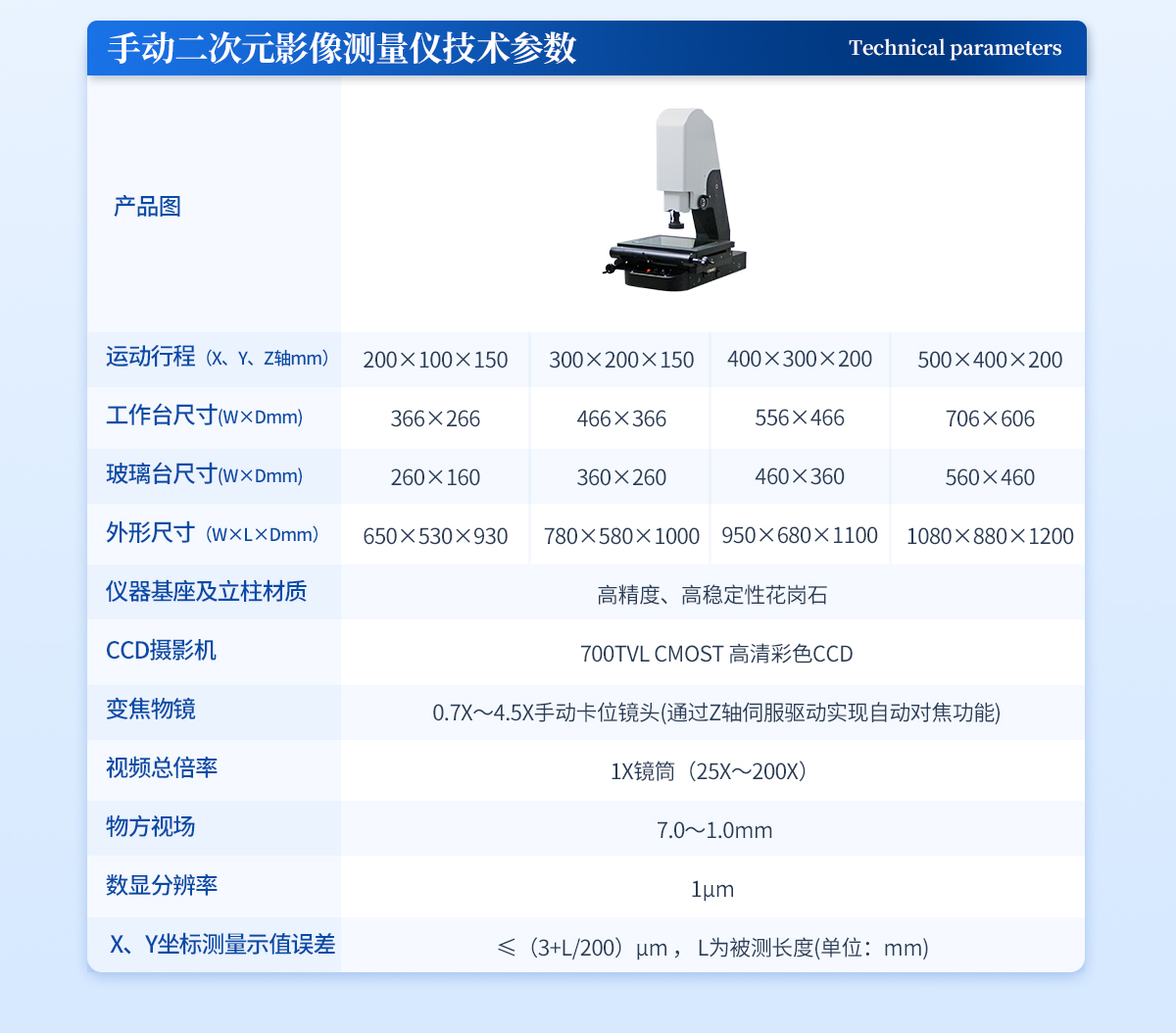 | l 運(yùn)動(dòng)行程(X、Y、Z軸mm):100×100×75 | l 工作臺(tái)呎寸(W×Dmm): 232×232 | l 玻璃臺(tái)呎寸(W×Dmm): 110×110 | l 外形尺寸(W×L×Dmm): 300×450×650 | l 工作距離:90mm | l 儀器材質(zhì): 高精度硬質(zhì)鋁基座+航空鋁工作臺(tái) | l CCD攝影機(jī):COMST 700TVL模擬信號(hào)高清彩色CCD | l 變焦物鏡: 0.7X~4.5X連續(xù)變焦鏡頭 | l 視頻總倍率:1X鏡筒(25X~200X) | l 物方視場(chǎng): 7.0~1.0mm | l 數(shù)顯分辨率:1μm | l X、Y坐標(biāo)測(cè)量示值誤差≤(3+L/200)μm , L為被測(cè)長(zhǎng)度(單位:mm) | l 操作方式:手動(dòng)移動(dòng)平臺(tái) |