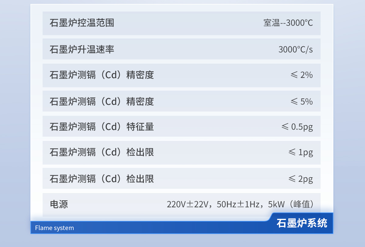 整機(jī)單色器類(lèi)型:切爾尼-特納型(Czerny-Turner) 波長(zhǎng)范圍:190nm~900nm 波長(zhǎng)準(zhǔn)確度:±0.25nm 波長(zhǎng)重復(fù)性:< 0.05nm 光譜帶寬:0.1/0.2/0.4/0.7/1.4 nm 五檔自動(dòng)切換 火焰系統(tǒng) 精密度:< 0.8%(火焰法測(cè)銅) 檢出限:< 0.008ug/mL 特征濃度:< 0.025μg/ml/1%(火焰法測(cè)銅) 靜態(tài)穩(wěn)定性: 0.003 Abs(static) 動(dòng)態(tài)穩(wěn)定性: 0.004 Abs(dynamic) 石墨爐系統(tǒng) 石墨爐控溫范圍:室溫--3000℃ 石墨爐升溫速率:3000℃/s 石墨爐測(cè)鎘(Cd)精密度:≤ 2% 石墨爐測(cè)鎘(Cd)精密度:≤ 5% 石墨爐測(cè)鎘(Cd)特征量:≤ 0.5pg 石墨爐測(cè)鎘(Cd)檢出限:≤ 1pg 石墨爐測(cè)鎘(Cd)檢出限:≤ 2pg 電源:220V±22V,50Hz±1Hz,5kW(峰值)