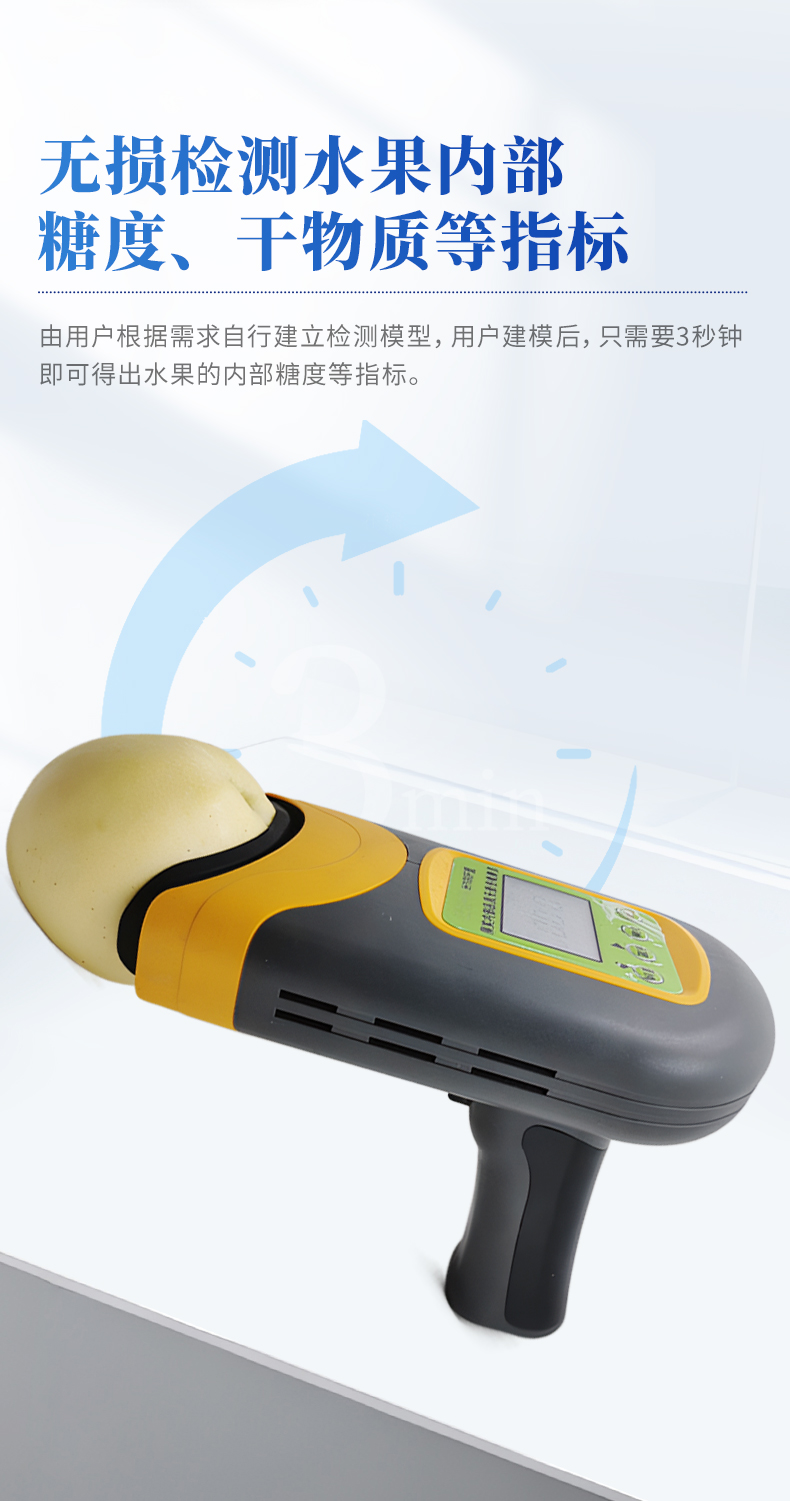 果實(shí)內(nèi)部品質(zhì)無(wú)損檢測(cè)儀是一款便攜式的果實(shí)質(zhì)量檢測(cè)儀,可以方便的檢測(cè)水果內(nèi)部的糖度、干物質(zhì)等指標(biāo),由用戶根據(jù)需求自行建立檢測(cè)模型,用戶建模后,只需要3秒鐘即可得出水果的內(nèi)部糖度等指標(biāo)。儀器內(nèi)置可充電鋰電池,單次充滿后可連續(xù)檢測(cè)2000次,檢測(cè)結(jié)果實(shí)時(shí)顯示在設(shè)備屏幕上,用戶可以通過(guò)數(shù)據(jù)線將檢測(cè)數(shù)據(jù)上傳到電腦中。