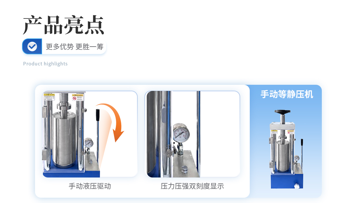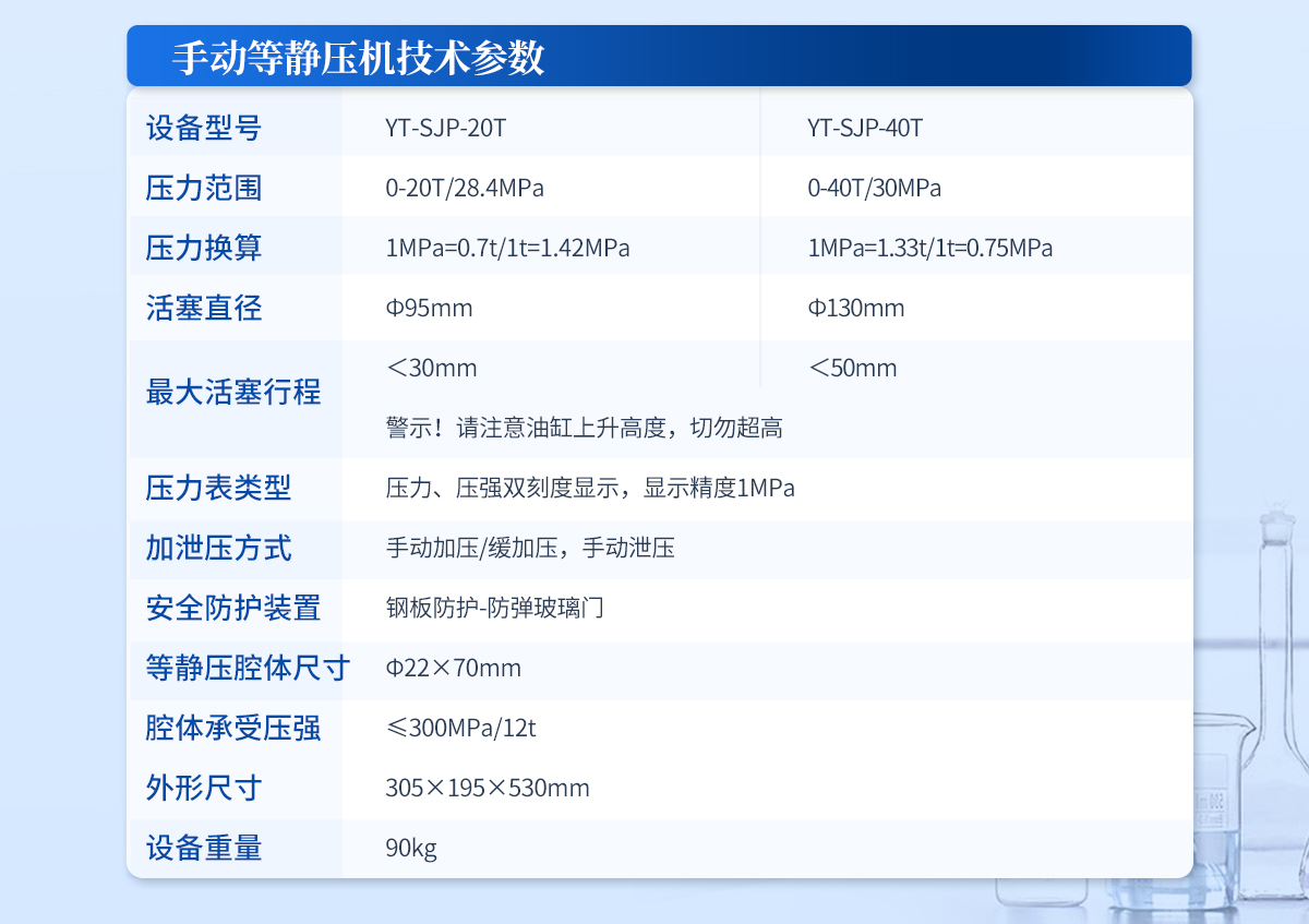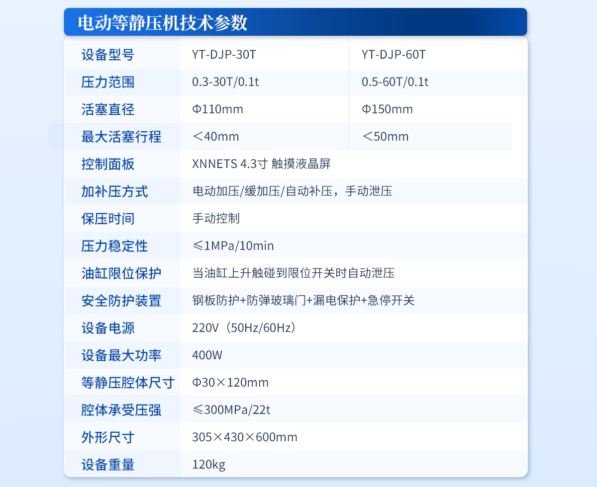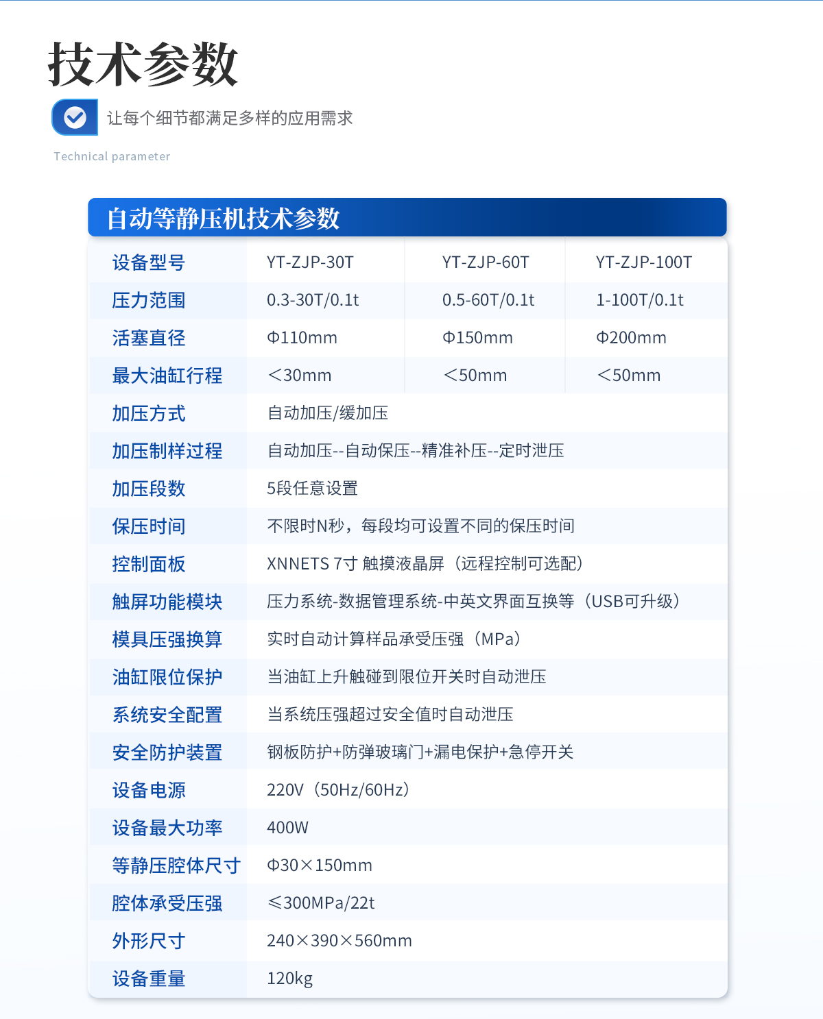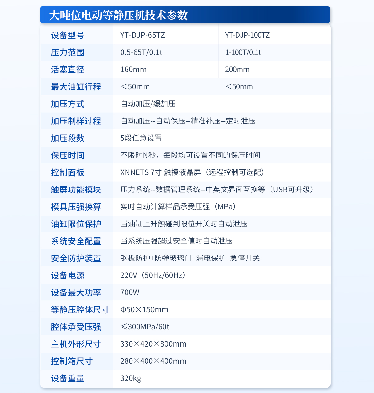 規(guī)格型號:YT-ZJP-100T壓力范圍:1-100T/0.1t活塞直徑 :Φ200mm**油缸行程:<50mm加壓方式:自動加壓/緩加壓加壓制樣過程:自動加壓--自動保壓--精準(zhǔn)補(bǔ)壓--定時(shí)泄壓加壓段數(shù):5段任意設(shè)置保壓時(shí)間 :不限時(shí)N秒,每段均可設(shè)置不同的保壓時(shí)間控制面板:XNNETS 7寸 觸摸液晶屏(遠(yuǎn)程控制可選配)觸屏功能模塊: 壓力系-統(tǒng)-數(shù)據(jù)管理系統(tǒng)--中英文界面互換等(USB可升級)模具壓強(qiáng)換算:實(shí)時(shí)自動計(jì)算樣品承受壓強(qiáng)(MPa)油缸限位保護(hù):當(dāng)油缸上升觸碰到限位開關(guān)時(shí)自動泄壓系統(tǒng)安全配置 :當(dāng)系統(tǒng)壓強(qiáng)超過安全值時(shí)自動泄壓安全防護(hù)裝置:鋼板防護(hù)+防彈玻璃門+漏電保護(hù)+急停開關(guān)設(shè)備電源:220V(50Hz/60Hz)設(shè)備**功率:400W等靜壓腔體尺寸:Φ60×150mm腔體承受壓強(qiáng): ≤300MPa/87t外形尺寸:330×580×720mm設(shè)備重量:290kg配置說明:等靜壓機(jī)1臺!可根據(jù)需求定制500MPa等靜壓機(jī)或橡膠模具