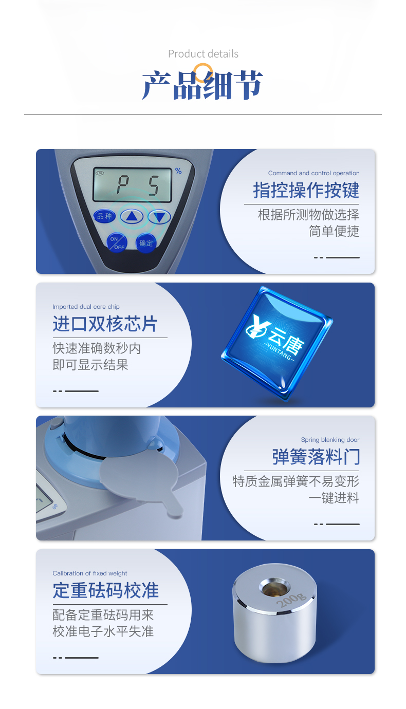 | 容重?fù)Q算:獨(dú)特的專利容重取樣裝置在**測(cè)量小麥的同時(shí),可以直接換算出小麥容重指標(biāo)。 | 測(cè)量范圍:可測(cè)量谷類、玉米、東北玉米、大麥、小麥、白小麥、大米、豆粕、花生仁、菜粕、高粱、黑芝麻、棉籽、棉粕、秈谷、大豆、油菜籽、飼料、蔬菜種子等非金屬顆粒狀物質(zhì)。 | 快速準(zhǔn)確:數(shù)秒內(nèi)即可顯示結(jié)果,測(cè)量誤差≤±0.5℅ | 操作簡單:20個(gè)常見品種已預(yù)先定標(biāo),不需秤樣、用料簡取樣后可立即測(cè)量水分 | 水分測(cè)量范圍:3-35℅ | 使用環(huán)境溫度:0~40℃ | 溫度補(bǔ)償:自動(dòng) | 定 標(biāo):浮動(dòng)四點(diǎn)定標(biāo),品種不限(常見品種20個(gè)已預(yù)先定標(biāo),可直接測(cè)量) | 工作電源,直流6V(5號(hào)干電池四節(jié)) | 自動(dòng)關(guān)機(jī):超過三分鐘無操作自動(dòng)關(guān)機(jī)。 | 便攜方便:重約1千克、外型小巧、電源交直流二用,適合各種工作場(chǎng)合 | 適合國情:用戶可對(duì)本地特殊品種采用本機(jī)獨(dú)創(chuàng)的四點(diǎn)定標(biāo)法自行定標(biāo),自行修正水分值 | 高性價(jià)比:技術(shù)含量高,性能**而價(jià)格相比同類產(chǎn)品較低。 |