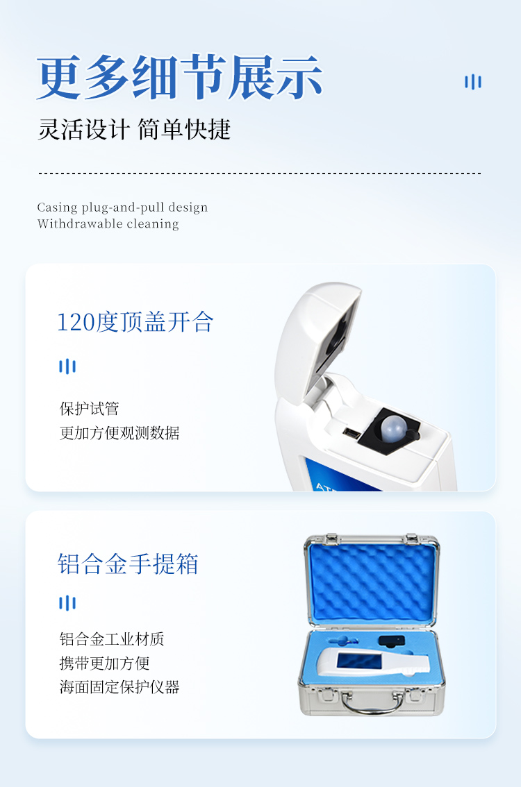 | 實(shí)用性 —— 可根據(jù)環(huán)境檢測需求設(shè)定上下限值,做到數(shù)據(jù)快速評估預(yù)警,表面潔凈度快速篩查。 | 靈敏度高 —— *************** | 速度快 —— 常規(guī)培養(yǎng)法18-24h以上,而ATP只需要十幾秒鐘 . | 可行性 —— 微生物數(shù)量與微生物體內(nèi)所含ATP有明確的相關(guān)性。 通過檢測ATP含量,可間接得出反應(yīng)中微生物數(shù)量 | 可操作性 —— 傳統(tǒng)培養(yǎng)方法需要在實(shí)驗(yàn)室由經(jīng)過培訓(xùn)的技術(shù)人員進(jìn)行操作;而ATP快速潔凈度檢測操作非常簡便,只需簡單的培訓(xùn)即可由一般工作人員進(jìn)行現(xiàn)場操作。 | 體驗(yàn)更好 —— 試子套管采用插拔式靈活設(shè)計(jì),可定期清洗長期使用,延長儀器壽命。 |