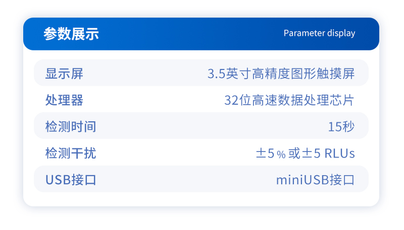 | 顯示屏:3.5英寸高精度圖形觸摸屏 | 處理器:32位高速數(shù)據(jù)處理芯片 | 檢測精度:********** | 大腸菌群:******** | 檢測范圍:*************** | 檢測時間:15秒 | 檢測干擾:±5﹪或±5 RLUs | 操作溫度范圍:5℃到40℃ | 操作濕度范圍:20—85﹪ | ATP回收率:90-110% | 檢出模式:RLU、大腸菌群篩查 | 50個用戶ID 設(shè)定 | 可設(shè)定的結(jié)果限值個數(shù):251個 | 自動判斷合格與不合格 | 自動統(tǒng)計(jì)合格率 | 內(nèi)置自校光源 | 開機(jī)30秒自檢 | 配有miniUSB接口,可將結(jié)果上傳至PC | 配備專用軟件驅(qū)動U盤代替?zhèn)鹘y(tǒng)光盤 | 儀器尺寸(W×H×D):188 mm×77mm×37mm | 使用可充電鋰電池免電池更換 | 備用狀態(tài)(20℃):6個月 | 中文操作手冊 | 穩(wěn)定的液體熒光素酶 | 潤濕的一體化采集拭子 |